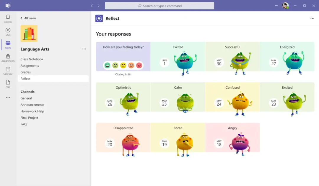 同样,在创建他们使用的工具时,他们并不经常被征求意见,对于情绪怪兽背后的团队来说,逆势而上很重要。学生的意见反映了 Microsoft Reflect 和情绪怪兽开发的每个阶段,这让学生代表了解他们希望如何通过我们的产品表达自己。