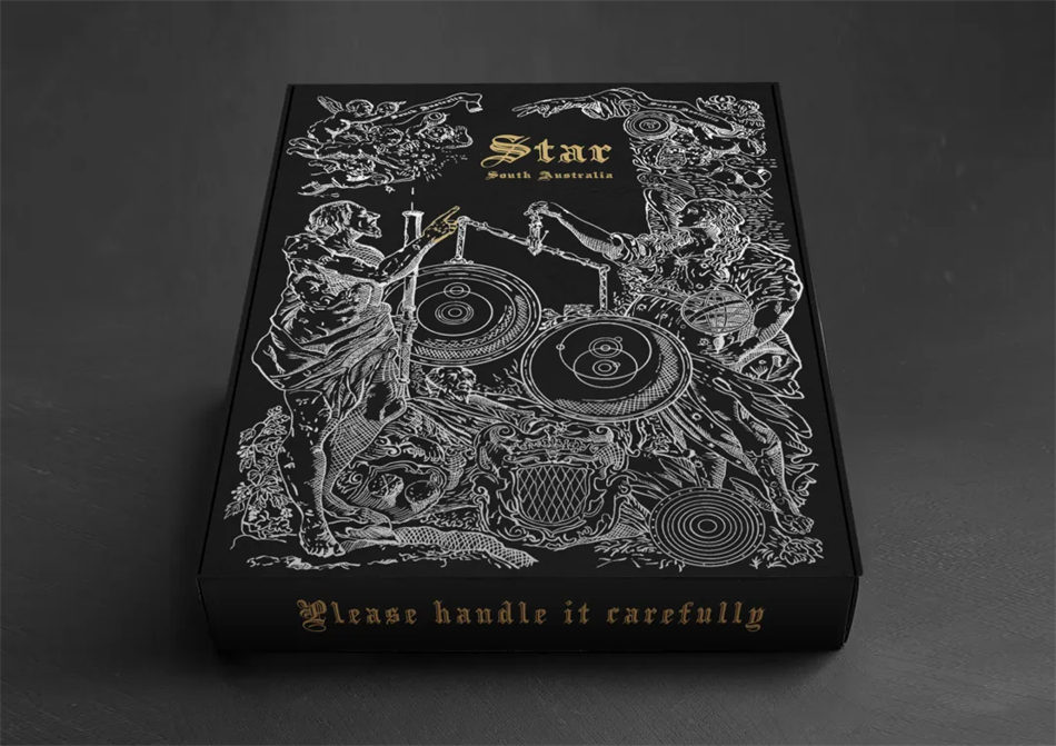 插画,迅速传递“满天星”历史由来。早在一千多年前欧洲科学家便开始探索天体文化,加里士多德爵士右手所指的方向,便是众人充满疑惑的星空宇宙。手指的地方,是满天星干红葡萄酒包装设计的起点。小面积的手关节与品名印刷,不仅考量了印刷成本。而且醒目的金色如同“开始”按钮一般,带领消费者感受千年之前的“探寻星空故事”。