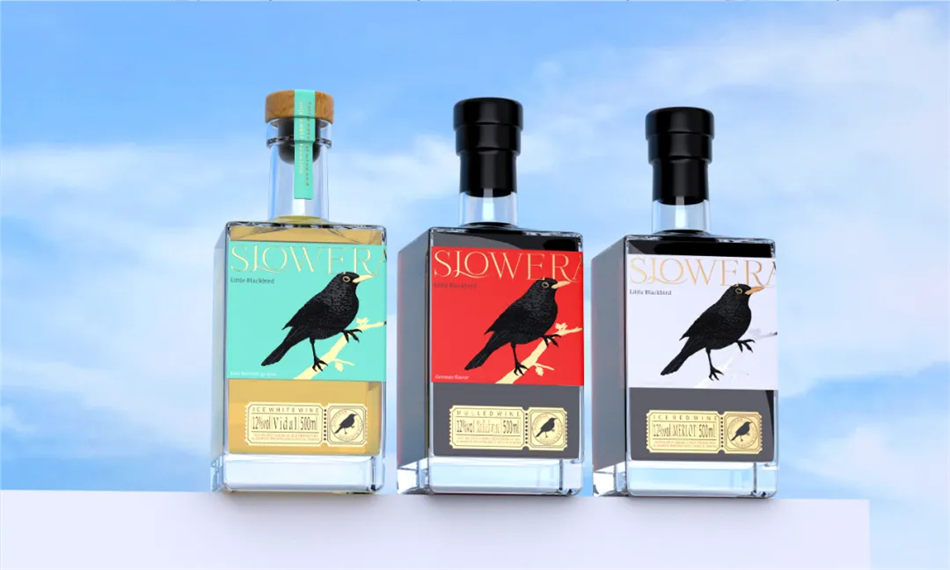“小黑鸟”的由来是品牌主打的冰红原料“美乐”。在一次与企业主的沟通中发现,在法国的美乐(Merlot)与当地一种小黑鸟(Merle)发音近似,所以当地人也会称美乐为小黑鸟。因此有了此次Slowerain诗露薇品牌葡萄酒包装设计