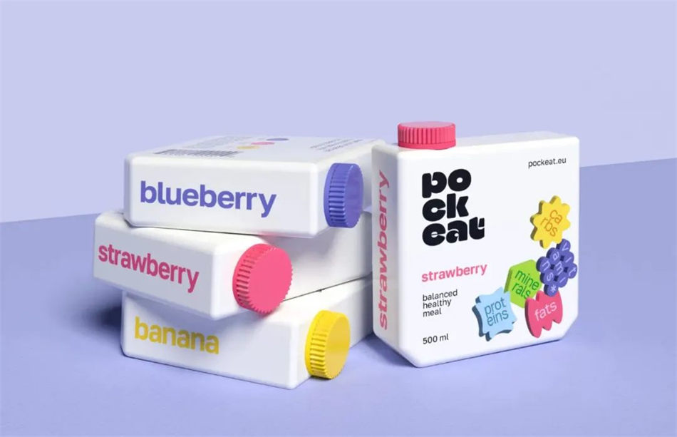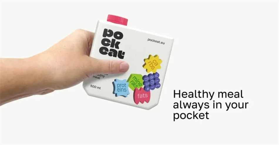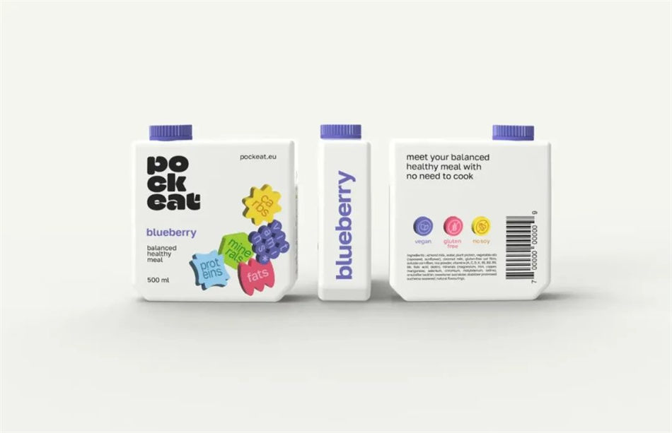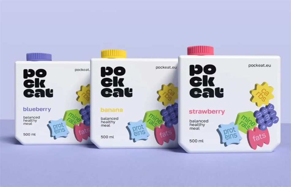 这种饮料式的营养补充剂包装设计就像一个口袋,里面装着一顿饭所必需的所有营养,而且它总是在手边。这一理念体现在命名和品牌设计体系中。命名pocket + eat = pockeat显示了这个概念的隐喻。该膳食营养补充剂产品的受众是有健康意识的现代年轻人,而且这些年轻人也越来越多。