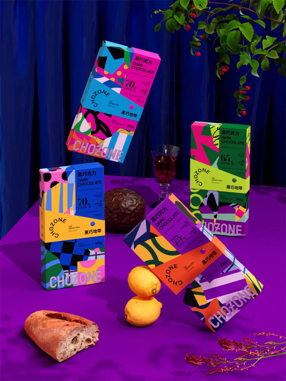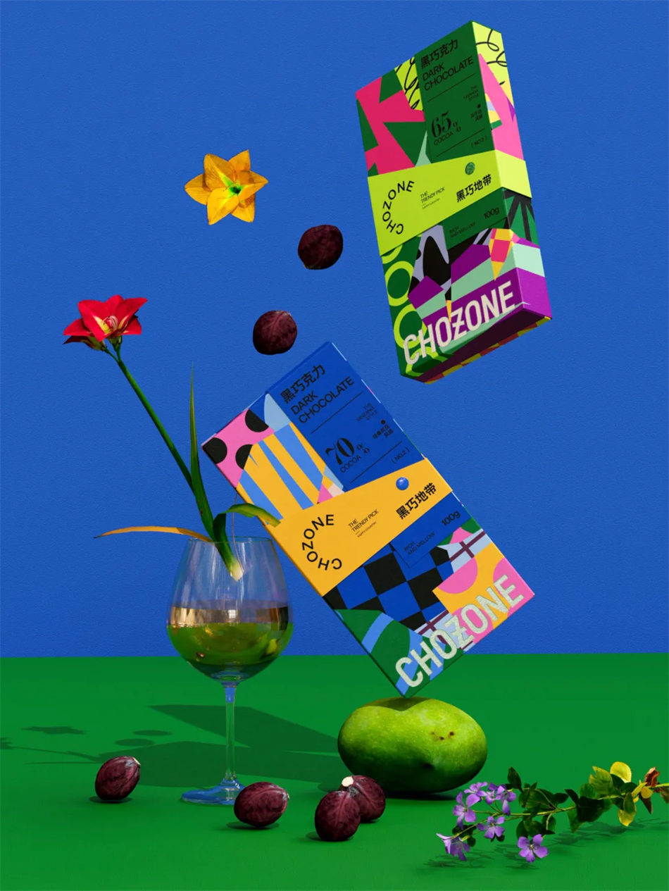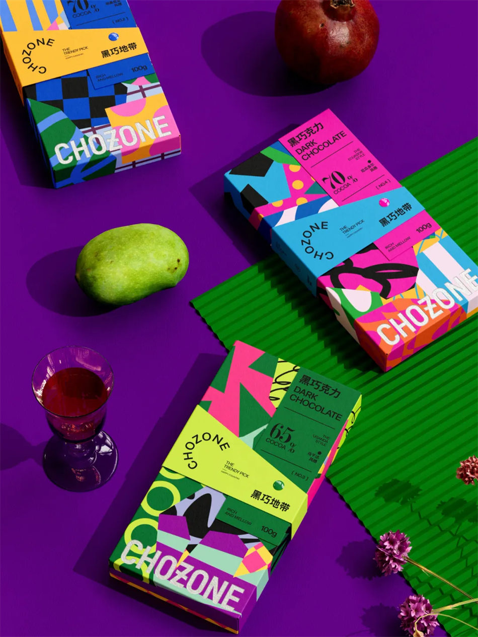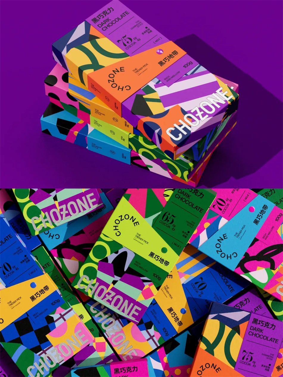 因此,我们巧妙地将几何图形的精准,与绚丽色彩的活力融入巧克力品牌包装设计之中,旨在捕捉那份来自热带的原始冲动与纯粹享受。