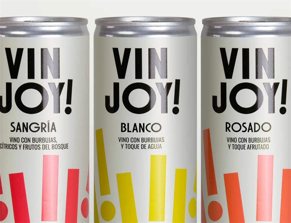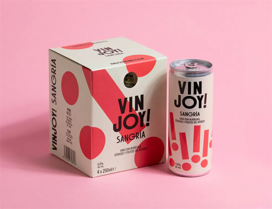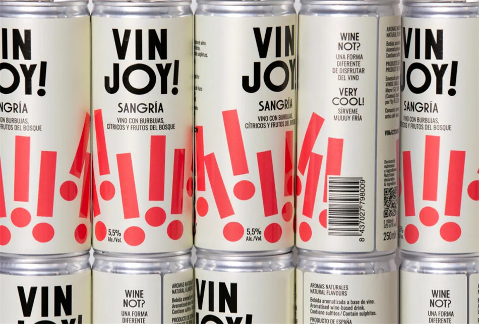VINJOY! 葡萄酒饮料包装设计从图形上看,采用简单但富有表现力的字体,并重复使用感叹号。这个超级符号,传达了运动、舞蹈、乐趣和产品的活力。在颜色方面,它基于奶油色背景的桑格利亚酒色调,高亮度和高对比度,让品牌符号更加突出和有吸引力。感叹号的图形资源将根据每种产品的口味来改变颜色,形成不同系列的产品矩阵。