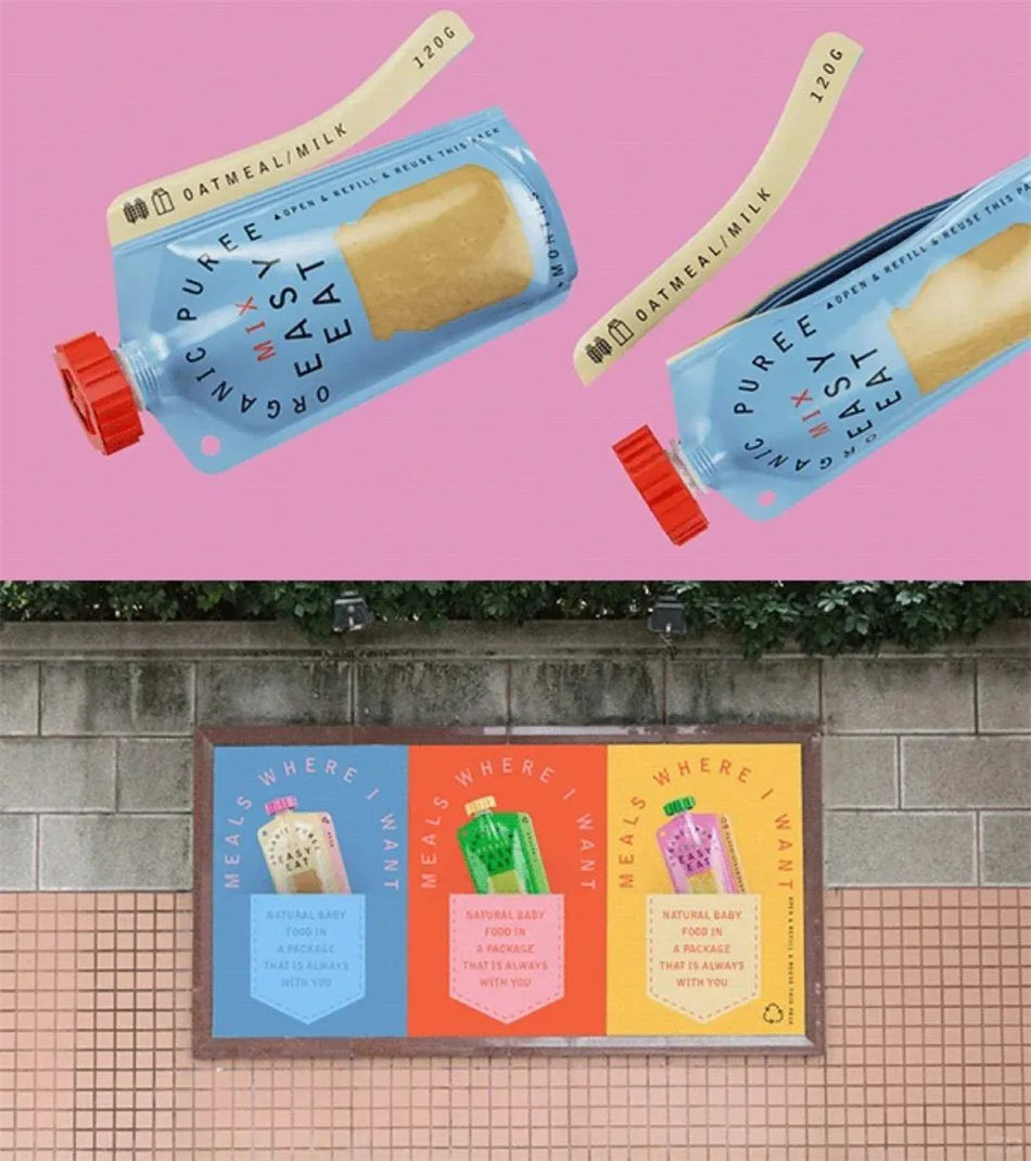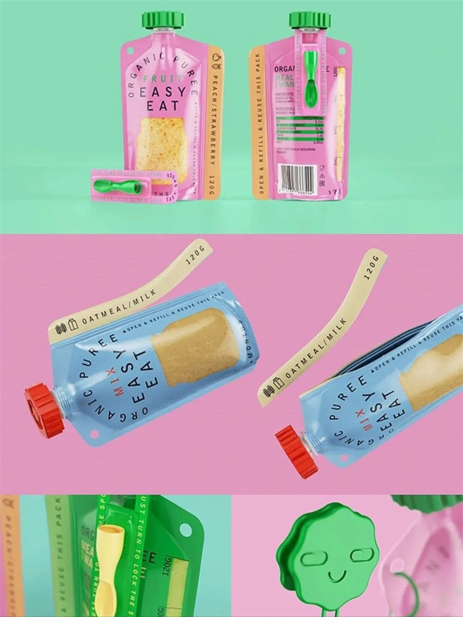 EASY EAT 是采用简单可重复使用包装的有机婴儿果泥系列,EASY EAT有机婴儿果泥包装设计并且只需撕下右侧标有果泥味道名称的胶带,将自制果泥填满包装,并牢牢拉紧拉链盒。准备好了!