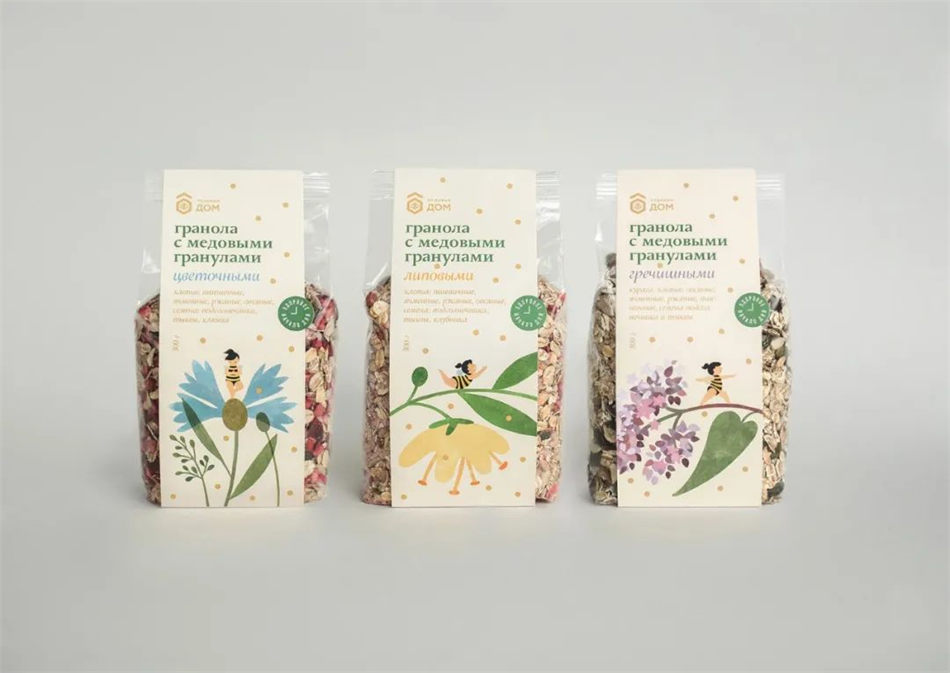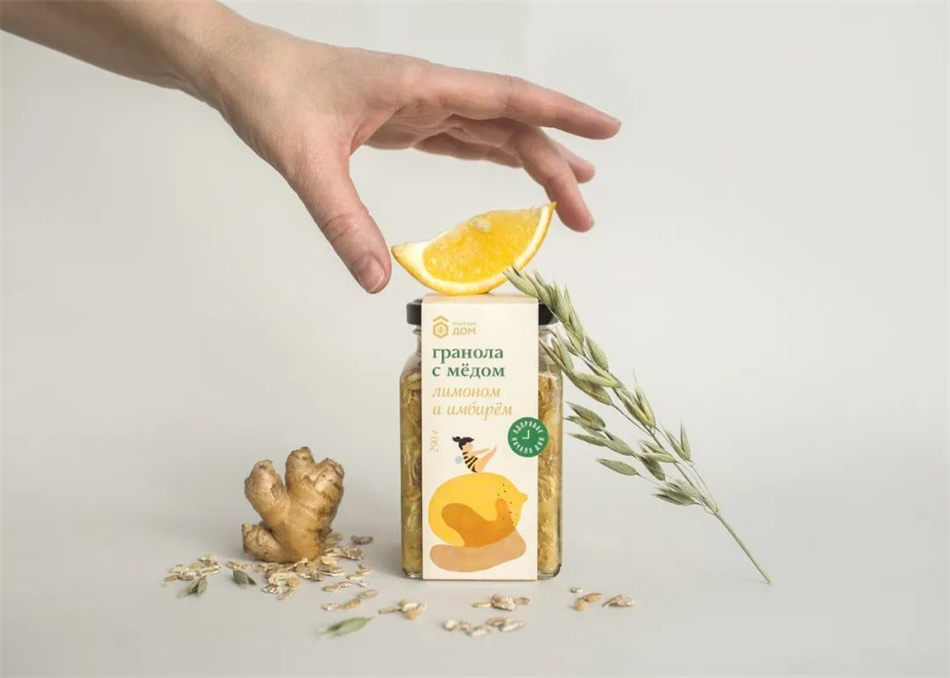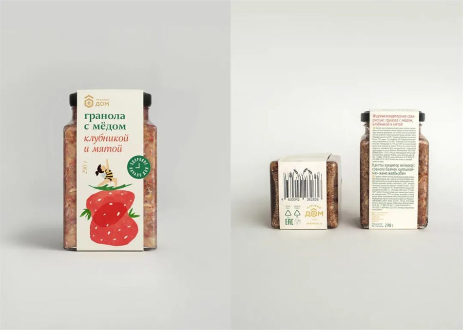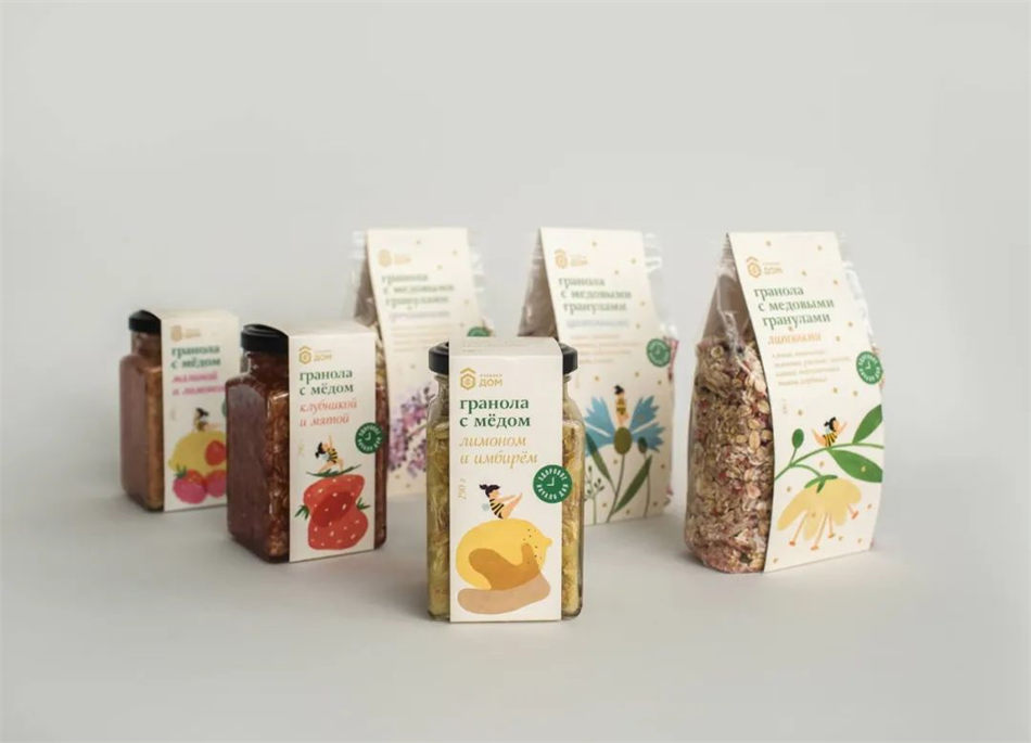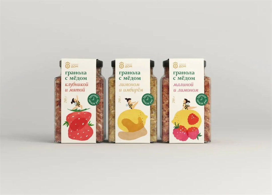 设计师:Nastya Lukina \ 插图画家:Toia Li \ 地点:俄罗斯 \ 项目类型:已发布的商业设计 \ 客户:Honey House \ 产品发布地点:俄罗斯 \ 包装内容:蜂蜜麦片 \ 包装材料:玻璃瓶,纸,塑料 \ 印刷工艺:胶版印刷,压花