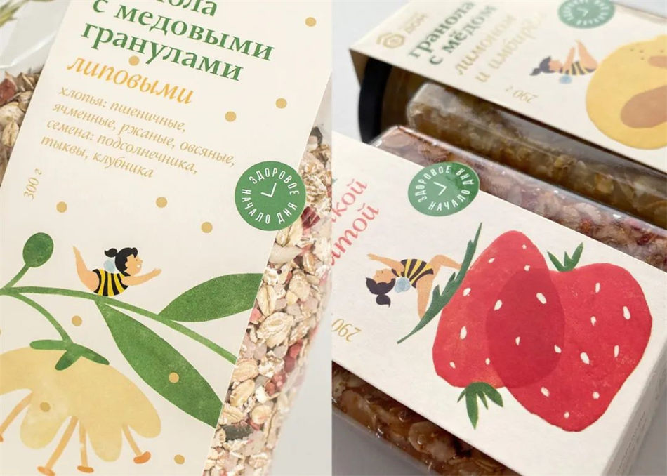 这款蜂蜜麦片是俄罗斯的一个早餐食品品牌,设计的任务是这款具有天然成分的早餐蜂蜜麦片包装设计,并且要表达该品牌的自然性和健康的生活方式。这款麦片是水果、植物、蜂蜜搭配的营养健康食品。