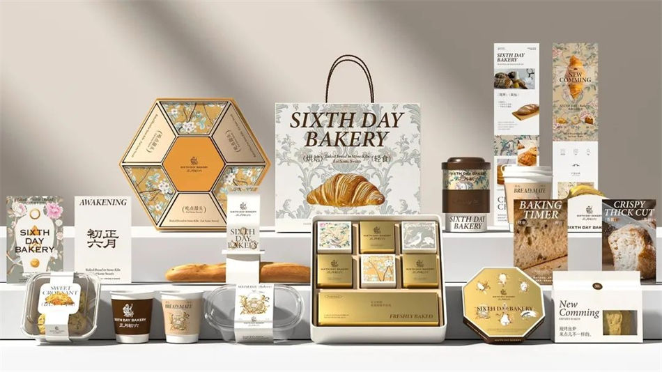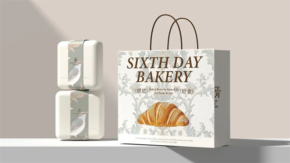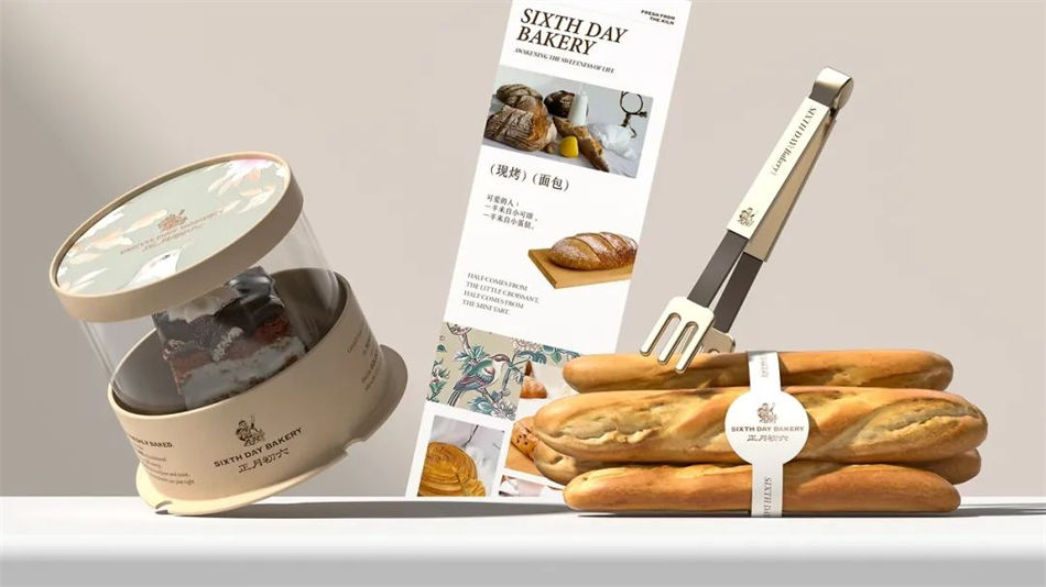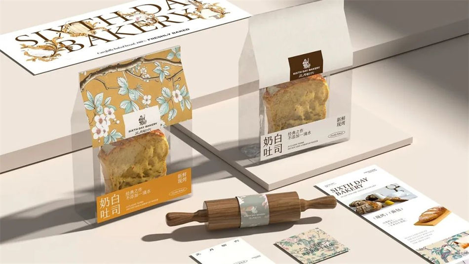 正月初六·轻食面包品牌包装设计方面,采用繁花等植被元素作为主视觉,结合英文品名打造独有的新中式+欧式双重风味,此外外包装还点缀有烘焙面包实物图,产品属性一目了然。