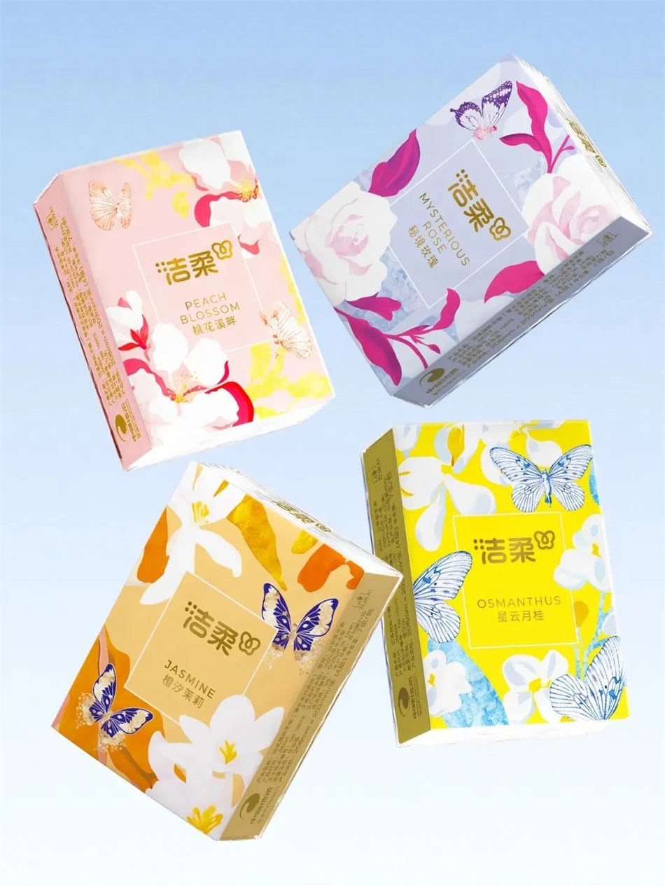 洁柔,中国家居用纸行业领导品牌之一。新品系列手帕纸包装设计的开发,延续洁柔的品牌理念,我们通过“蝴蝶”元素嫁接品牌精神,洁柔“破茧成蝶”,不断探索,创造出一代又一代优质的产品。