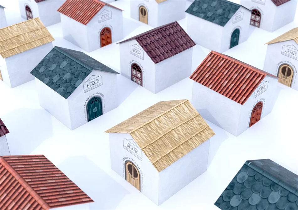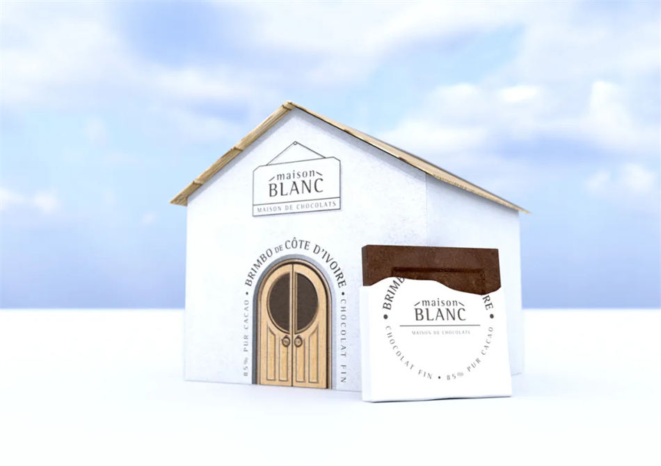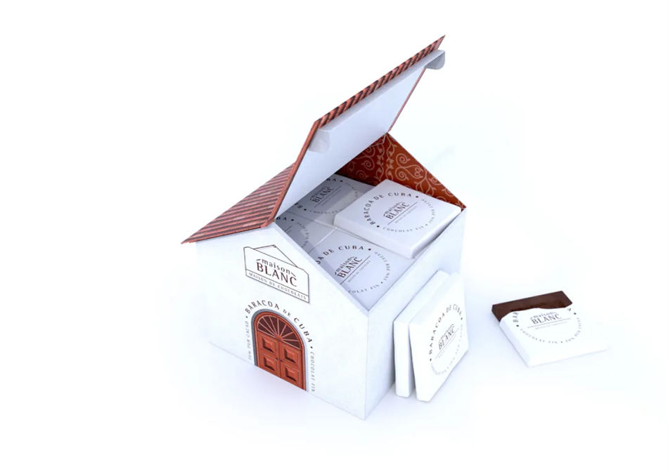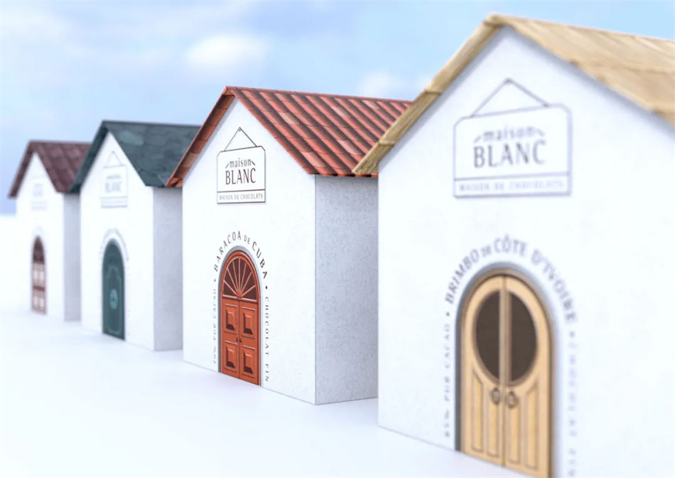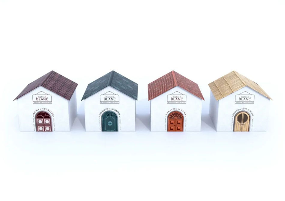 Maison Blanc 是一个出色的巧克力品牌,销售来自不同产地的系列优质巧克力。这些巧克力被装在一个个特别的小房子包装设计盒里,小房子的装饰使用了巧克力产地的传统形状和材料,总共体现了 4 个产地。门和屋顶可以很好的区别是来自哪个地方,而且还有区别巧克力不同口味的功能。