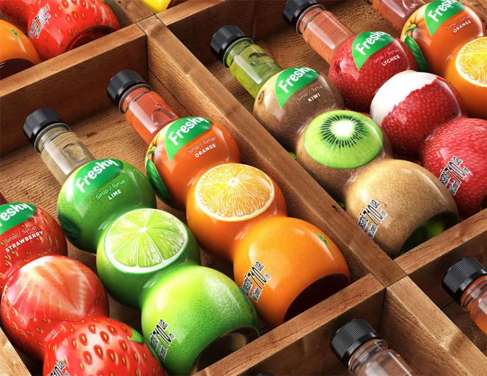Freshy Syrup通过结合水果堆叠形状的瓶子和模仿水果皮自然新鲜度的环绕式标签,创造了一种与消费者产生共鸣的表达形式。在大多数品牌都在使用相同的水果形象时,“Freshy Syrup”以其独特的瓶形和创意的设计手法获得了强大的市场竞争力。