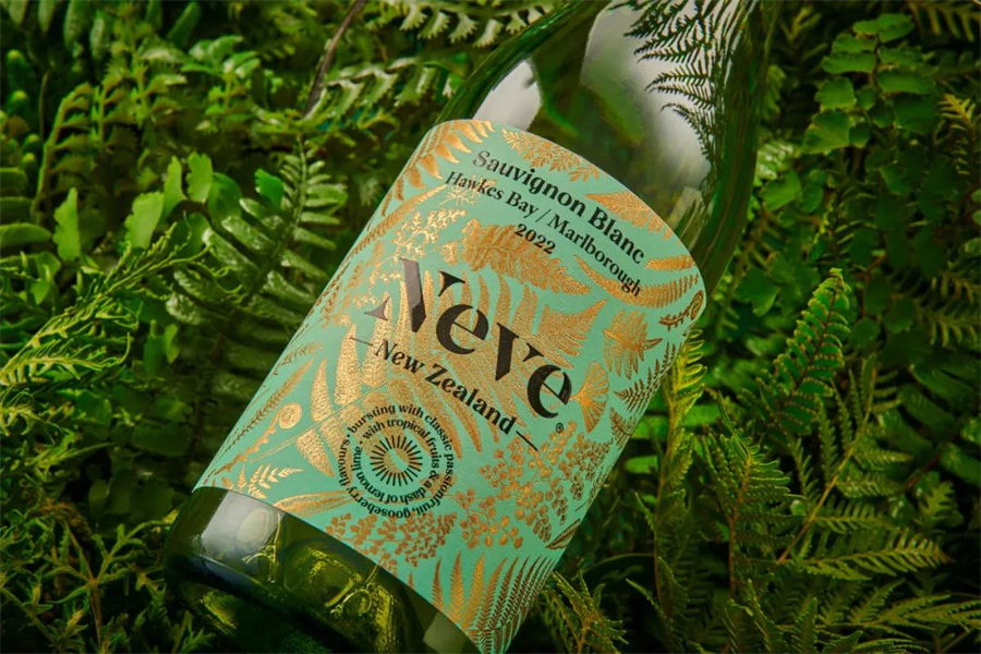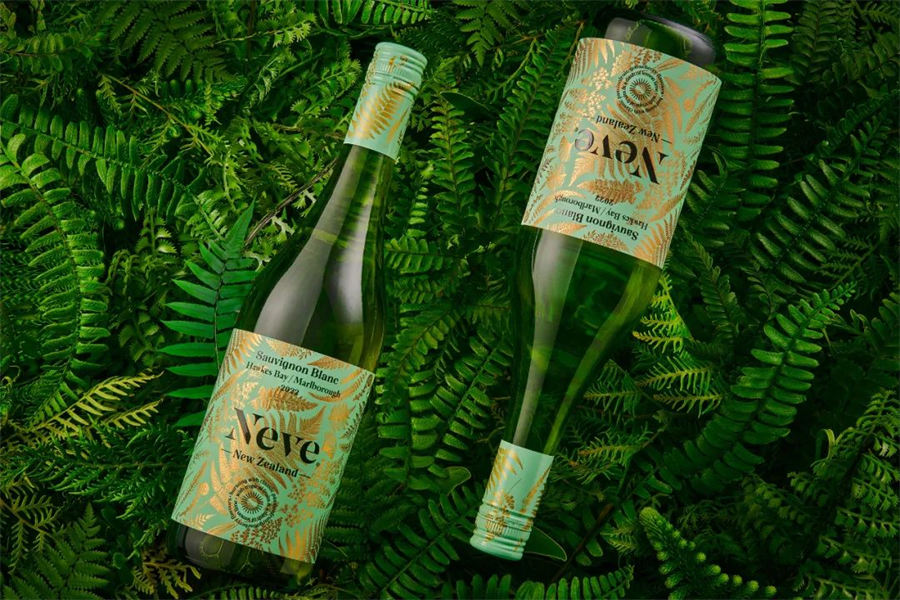 蕨类植物有着古老的血统,可以追溯到恐龙时代之前,成为这个国家民族认同的标志性元素。蕨类植物也启发了设计师,它象征着新的生命、成长、力量与和平。长相思葡萄酒标签设计将蕨类植物的叶子以金箔的工艺铺满在标签上,以表达蕨类植物的叶子已经成为这个国家的主要象征。