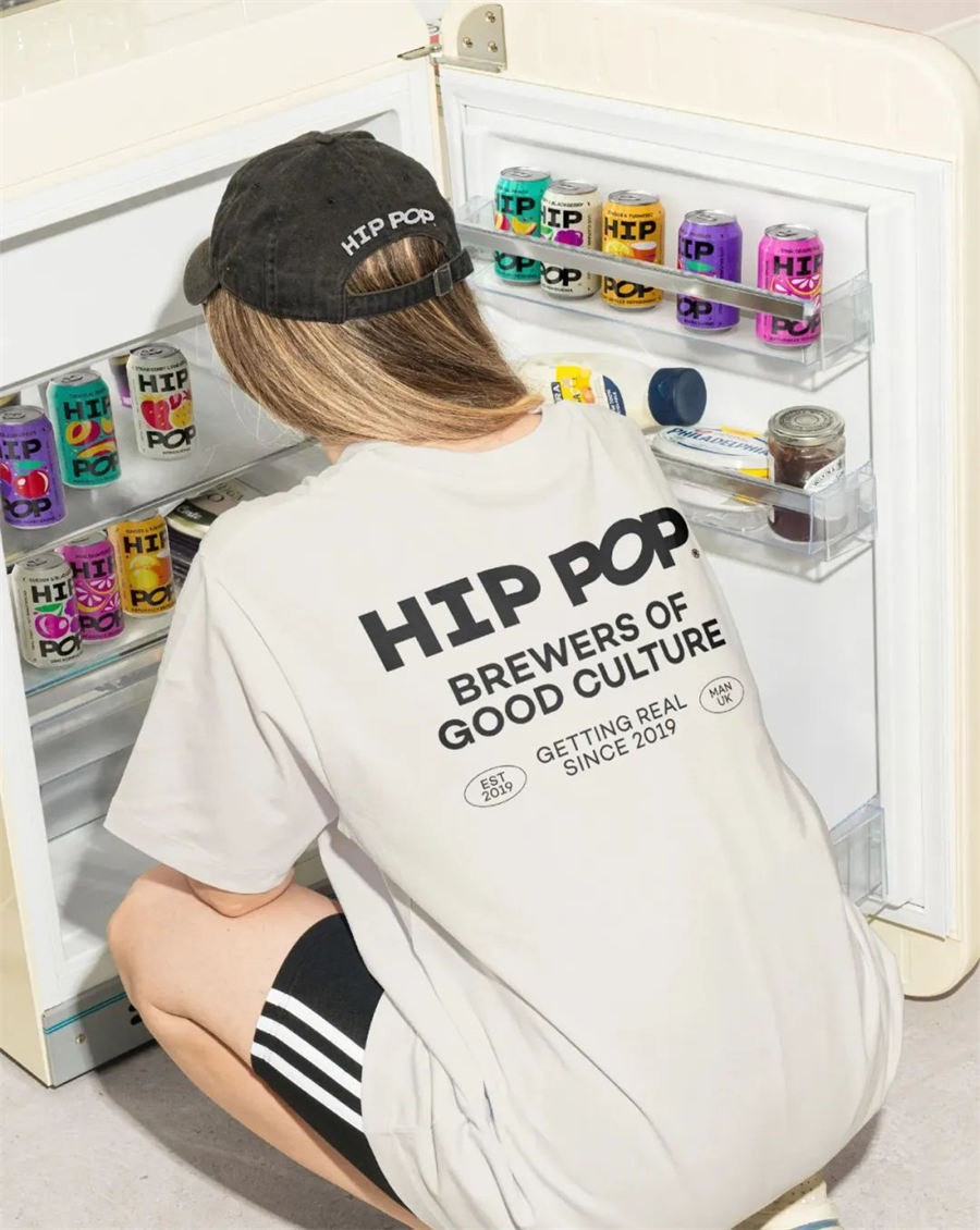 在苏打水包装设计方面,插画在视觉中间,另类个性的表现手法出现在标识中间。设计选择摒弃同类产品中常见的精致调色板,偏爱黑色,苏打水和康普茶的鲜亮对比色。现在,每个系列和口味都清晰可辨,这使得无论是在实体店还是在网上,都更容易发现和购买Hip Pop。这种设计体现了Hip Pop令人耳目一新的另类个性,是一种乐趣、能量和态度的爆发。