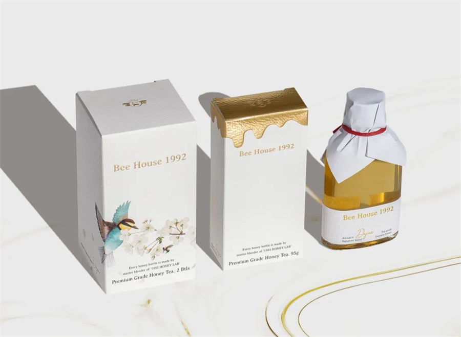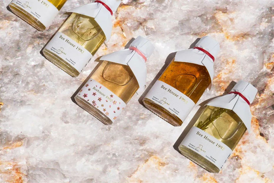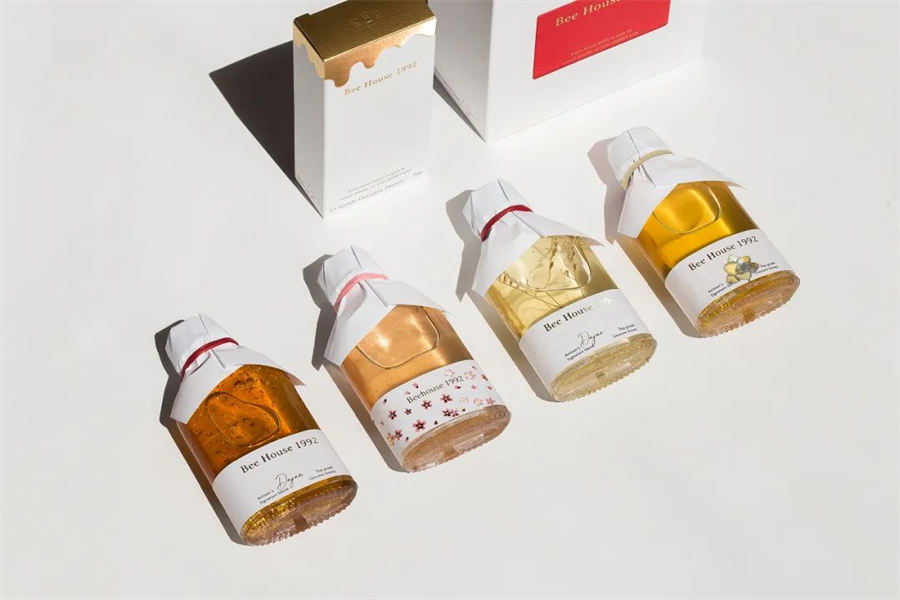 从设计角度来看,“Beehouse1992”茶饮品牌外包装设计视觉强调了流动蜂蜜的特性,搭配令人愉悦的香水瓶的外观,整体给一种花香四溢的感觉,这也是成为吸引喜欢社交的年轻消费群体的利器。容器偏离了传统的蜂蜜罐设计,采用了对用户友好的形状,方便拿取,易于倾倒。手工捆扎的纸盖体现了传统手工工艺的感觉,进一步增强了产品的高端吸引力。此外,瓶子、标签贴纸和包装完全不含塑料材料和乙烯基涂层,因此完全环保且可回收。