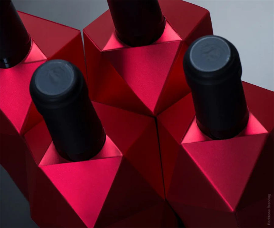 我们使用带有金属光泽的卡纸,通过特殊的印刷方式,使其有了深红宝石的色调,从不同角度看去可以折射出耀眼的光泽,就像红宝石在闪光一样。Rubin的结构设计为圆形底座加六边形主体,最末端为一个三角形。如果我们将 Rubin 葡萄酒整齐地排列在一起,从顶部视角看去,会看到一个完美的结构,它填满了相邻空间,没有任何缝隙,就像附着的石榴籽一样。