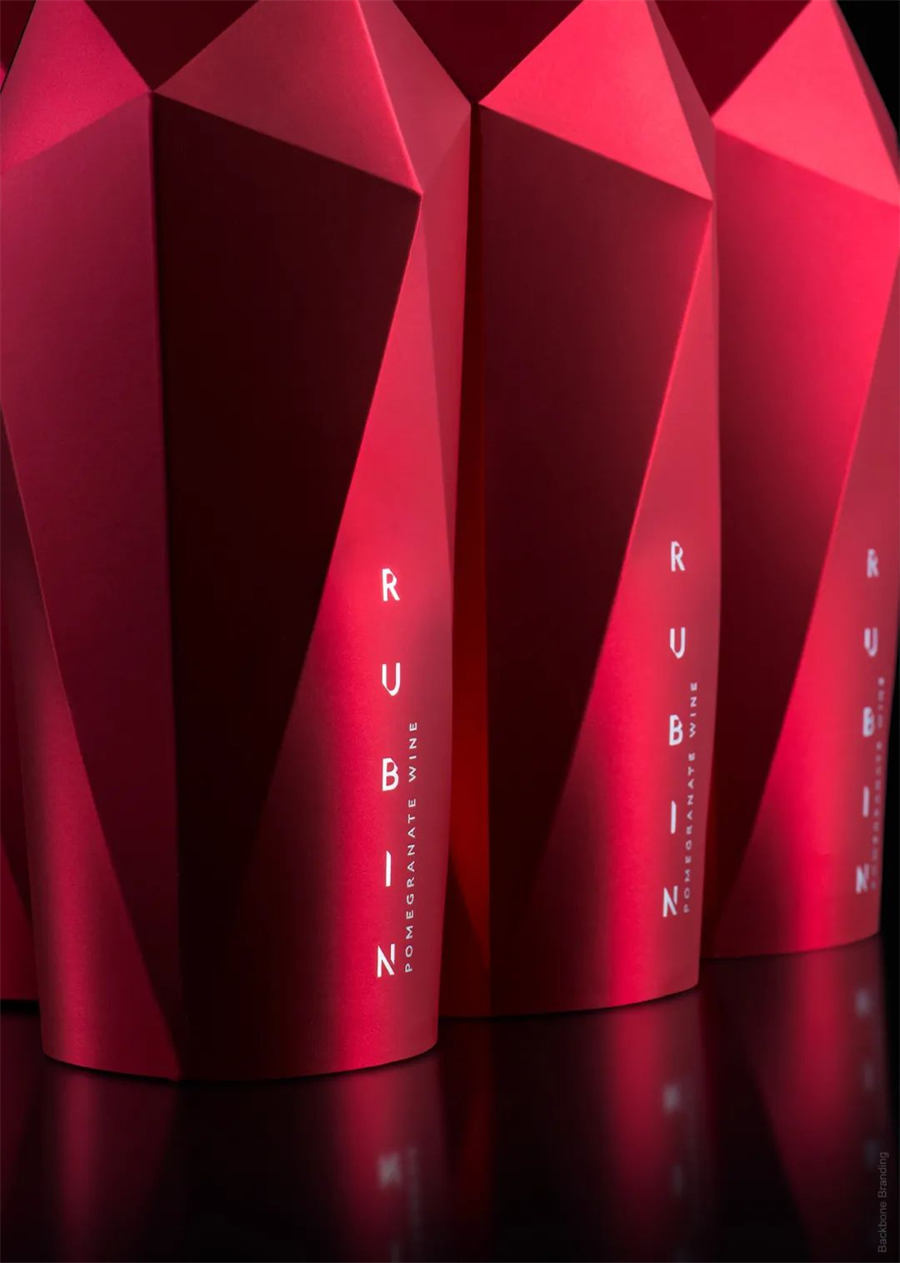 Rubin 是一款浓郁的石榴酒,色泽鲜红,酒香诱人。品牌名称让人想起了红宝石,它与石榴籽又非常的契合。此次Rubin石榴酒包装设计的灵感正是来自红宝石的形状,我们通过使用独特的设计结构,模拟制作出了宝石的形状,寓意这是一款高品质的酒。