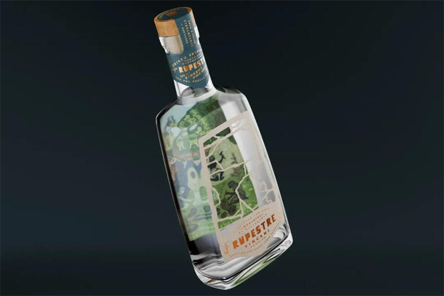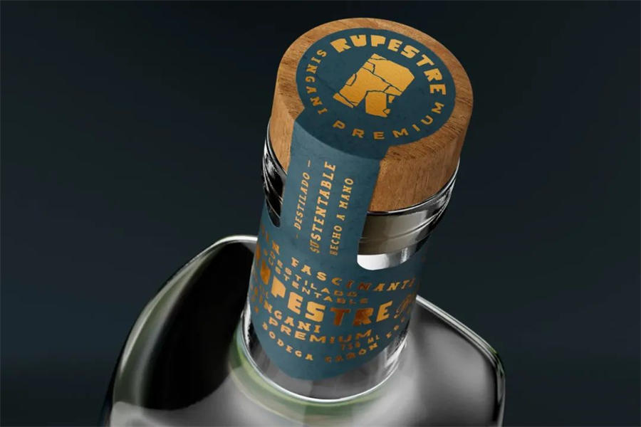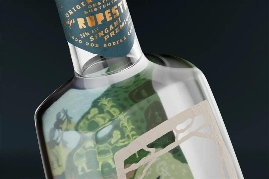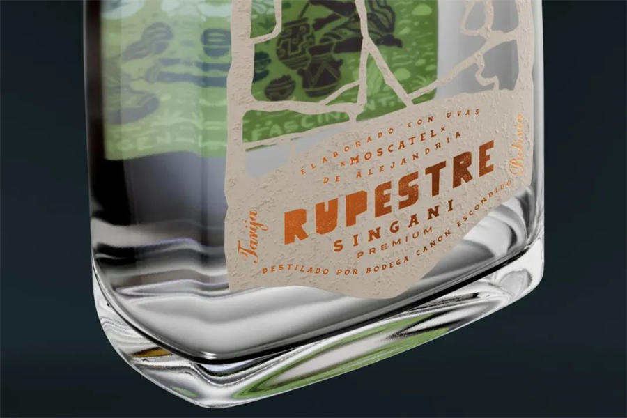 Rupestre Singani 的酒包装设计灵感源自玻利维亚塔里哈地区的祖先文化,巧妙融合了历史厚重感与现代美学。这款定制玻璃瓶身搭配精雕细琢的模切标签,如同一扇窗口,展现出一幅郁郁葱葱的插画风景 —— 既呼应了当地的岩画艺术,又传承了古老传统。设计师采用有机质朴的大地色系与肌理细节,强化了酒液本身的手工酿造质感;极简主义字体与金属箔细节的点缀,则为整体酒包装设计注入了现代奢华感。这种设计不仅生动呈现了玻利维亚传统工艺的深厚底蕴,更通过沉浸式视觉叙事,为消费者打造了一场跨越时空的感官盛宴。