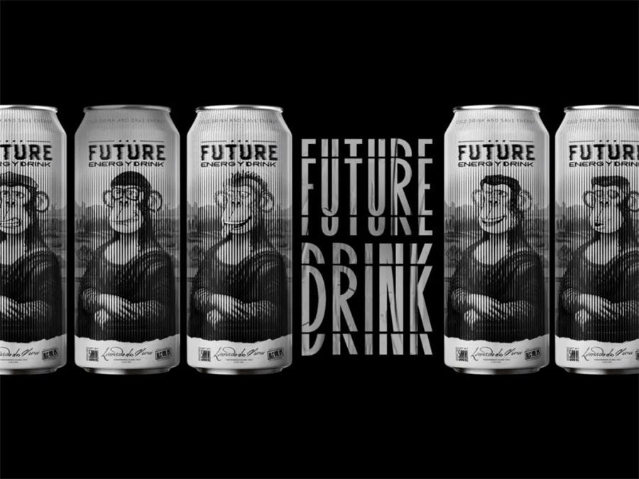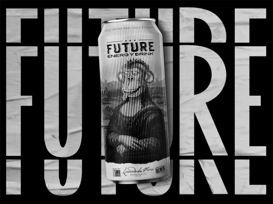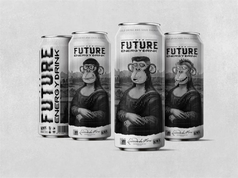 这是品牌FUTURE推出的新的能量饮料。在最初的能量饮料包装设计构思时,是想绘制一只顽皮、愤怒、快乐的猴子,来表达个人情绪与生活状态,但是感觉会比较普通,无法与竞品拉开差距。FUTURE主要销售区域是欧洲的一些大城市,在面对激烈的竞争市场我们在想,是否有更好的方式可以引起人们注意,帮助产品销售助力呢?在众多的思想碰撞中,我们找到了一个创意点。鉴于欧洲乃至全世界对达芬奇名画的熟知,我们想利用这一特点,将其名画作品与最初构思的猴子表情相结合,于是最终完成这款充满话题性的产品包装。