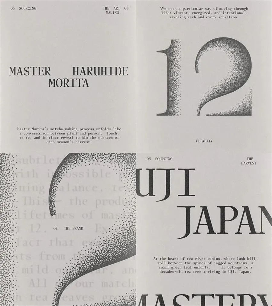 纽约12 Matcha抹茶茶饮品牌与包装设计,品牌形象以极简主义为核心,结合日本茶道文化的精髓,通过排版、色彩、材质、符号等多方面元素,共同塑造出一个现代、简约视觉形象。设计师通过细腻的点状粒子渐变效果,表现出抹茶粉的细腻质感,同时增加视觉上的层次感。 在多种物料上出现了点状粒子效果的圆形、弧线元素,象征茶碗、茶汤的流动感,强化品牌的禅意氛围。该作品来自设计机构Base Design。