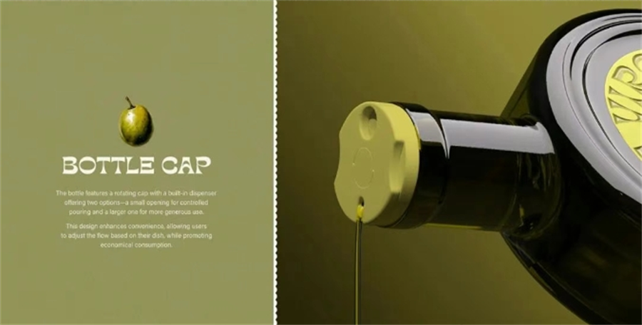 Oliwi橄榄油包装设计瓶采用旋转瓶盖,内置分配器,可提供两种倾倒选择:小开口用于控制倾倒量,大开口用于更大容量的倾倒。这种设计提升了便利性,用户可以根据菜肴调整倾倒量,同时也促进了经济效益。