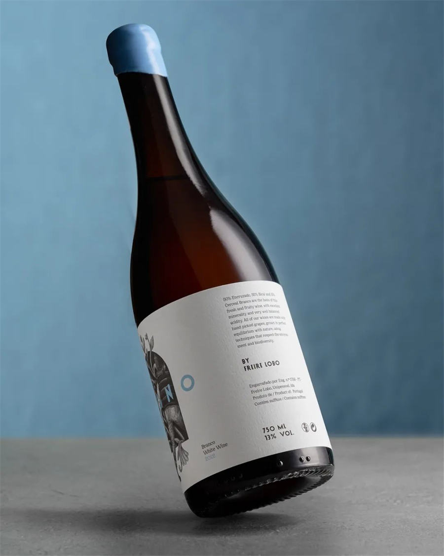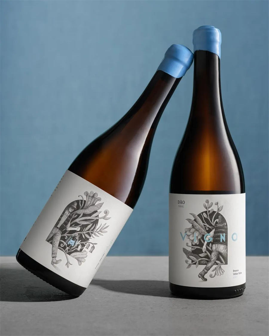 VIGNO白葡萄酒包装设计,标签采用黑白灰色调的设计,局部使用了亮蓝色。结合大面积的白色尽显简约纯粹感。在标签的正面和环绕到瓶身背面各有一副小的精致插图,第一张描绘了一位男人进入充满植物及黑色的隧道,第二张则描绘出男人手提油灯从隧道中走出来的画面,非常具有故事感。这也是根据作家by freire lobo的故事做出的插图。瓶身的正面和背面旋转起来看有趣、且耐人寻味。