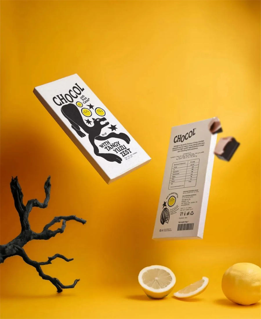 Chocol这个名字与xocolatl相呼应,xocolatl是玛雅人和阿兹特克人的原始可可饮料,同时也是黑色美洲虎,反映了品牌的野性和祖先的灵魂。插画绘制了一只抽象的黑色美洲虎,并且延展至多个口味当中。其抽象的表达提升了整个设计的艺术性。