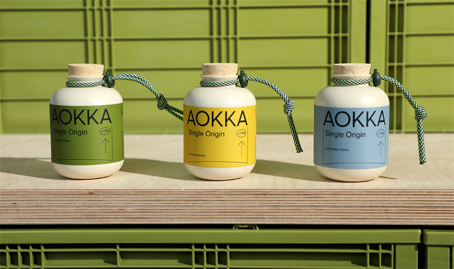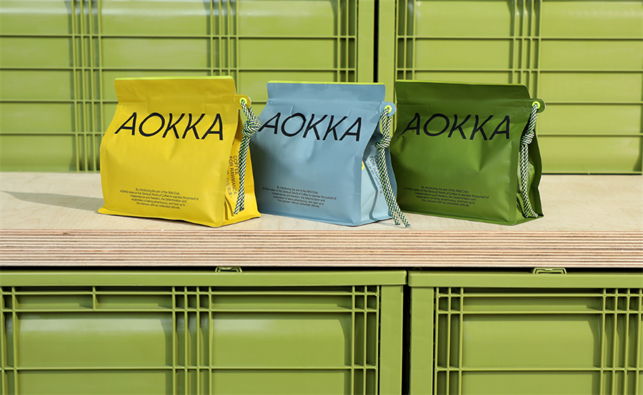咖啡农作物生长于世界各地的荒野之中,经过培育、采摘、处理变成咖啡生豆,每一包咖啡生豆经过物流运输到达目的地,并拥有AOKKA的运输标签和独有的封口绳.设计师将它们设计成专属为AOKKA咖啡的视觉语言,运用到咖啡品牌包装设计中。