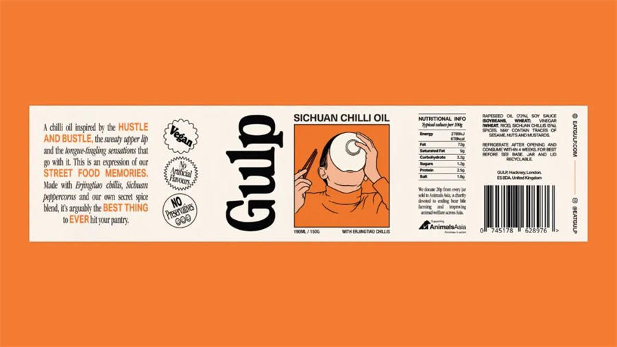 而Gulp油泼辣子包装设计更是围绕下饭神器而展开,一幅干饭的插画出现在标签上,仰头干饭暴风吸入的动作说明加了四川辣椒油的饭菜很香,从而引出四川辣椒油作用于下饭的重要影响,插画不仅仅幽默有趣,还伴有一股复古的艺术感。