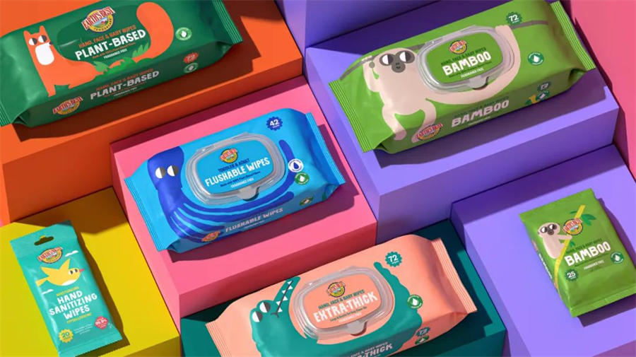此次Earth’s Best 有机婴儿湿巾包装设计以“动物朋友”为核心,构建了五位性格鲜明的产品吉祥物。每个动物不仅可爱,还精准传递了对应产品的功能特性:🐒