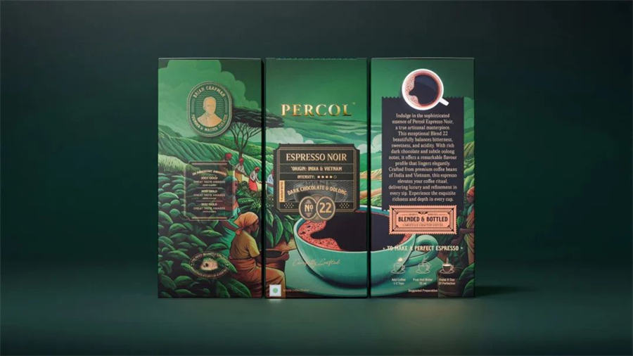 设计工作室:MAKE TANGIBLE \ 项目内容:咖啡包装设计 \ 项目状态:已发布的商业设计 \ 设计师:Vasanth Joshua \ 插画师:Saloni Ved \ 客户:Percol \ 地点:印度 \ 行业:食品饮料