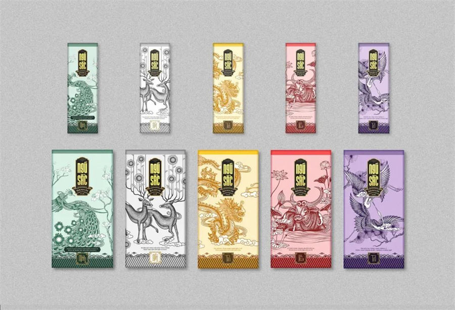 NGŨ SẮC糕点包装设计植根于中国儒家哲学中的“五常”概念:仁、礼、义、智、正。这五大道德支柱长期影响着越南人的思想、行为和精神生活。每一种美德都成为一种视觉和感官体验。