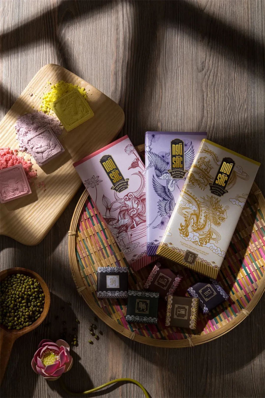 NGŨ SẮC糕点包装设计以绿色的清新和绿豆的细腻风味表达,唤起春天的活力和慈悲的精神。李氏穿着夏天鲜艳的红色,充满了莲花的意象和恭敬的克制。携带着大地的金色和龙的忠诚,代表平衡和信任。闪耀着秋天金属的洁白,高贵,就像向日葵天空下的鹿。
