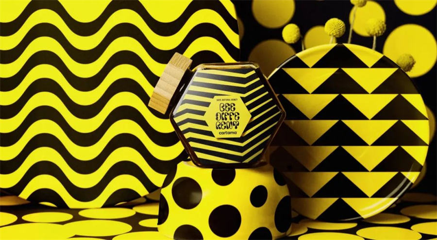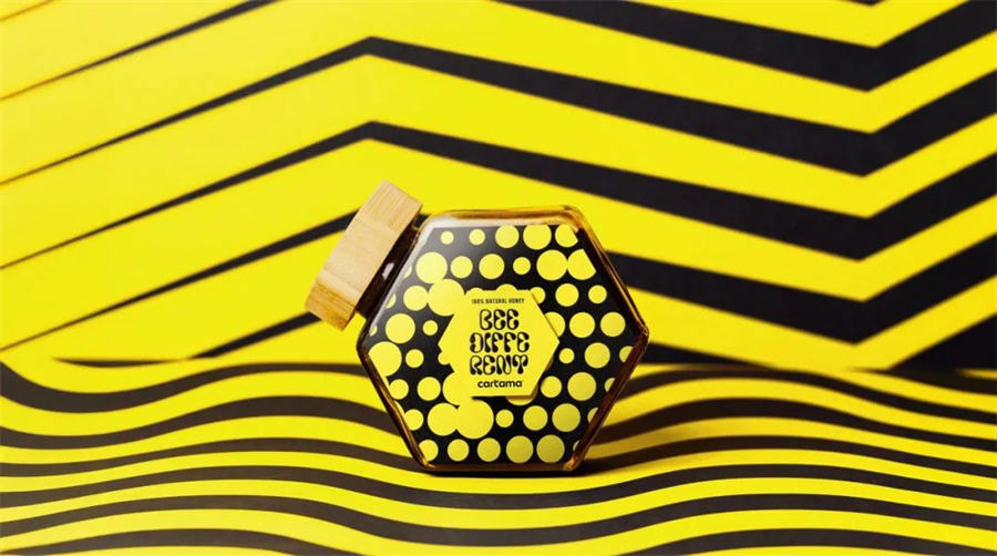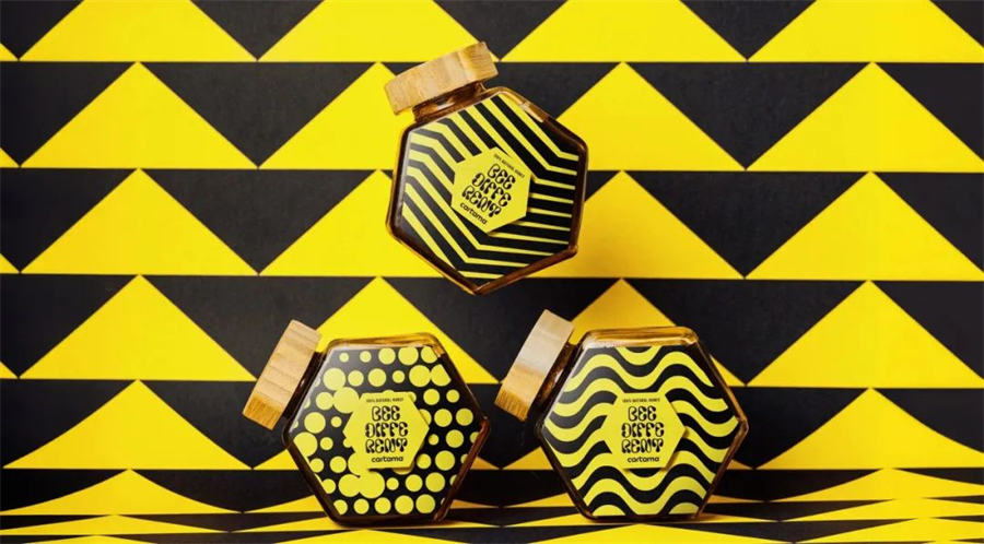 在一个被千篇一律的标签(几乎每个标签上都有模仿蜜蜂身体的横条纹)所主导的类别中,开始设计像这种蜂蜜背后的蜜蜂实际生活方式一样独特的Cartama蜂蜜包装设计。在研究世界范围内的蜂蜜种类时,研究发现了一种几乎无处不在的图形模式:黄色和黑色条纹的使用水平排列,让人想起蜜蜂的身体。