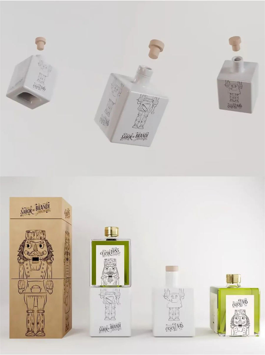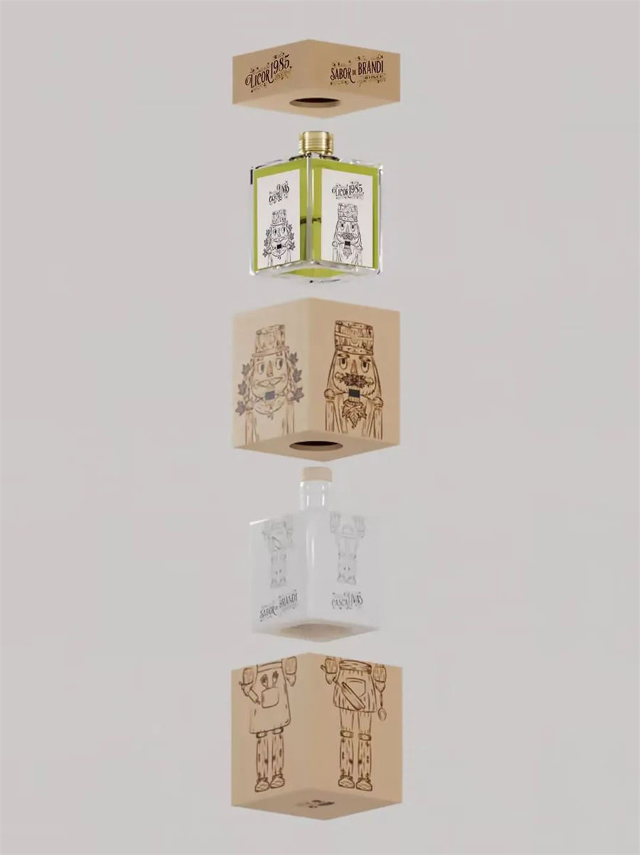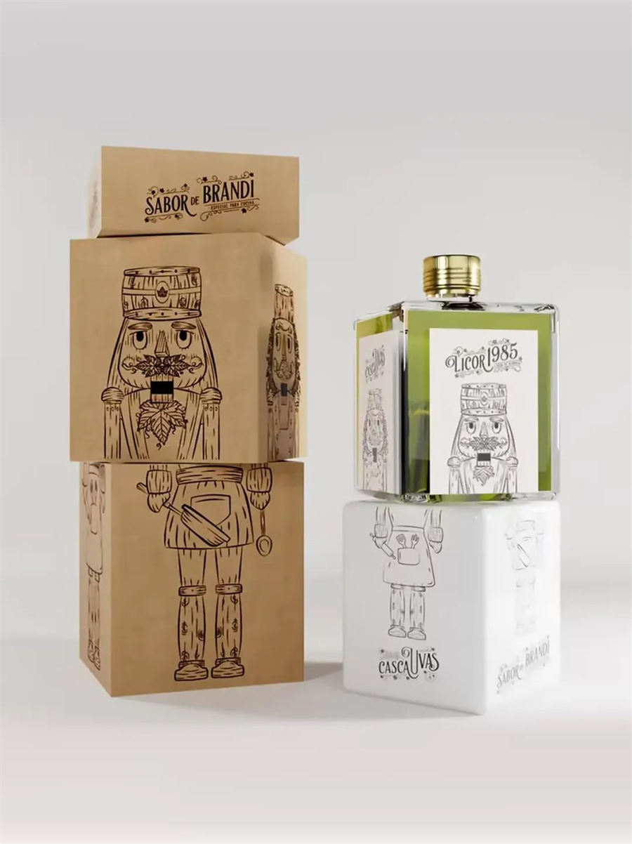 Cascauvas 利口酒包装设计松木外盒匠心打造旋转组合机关,轻轻转动便能拼合出形态各异的 “Cascauvas” 士兵造型,其模块化趣味设计灵感源自西班牙 Baturrocks 巧克力的创意玩法,极大激发收藏爱好者的珍藏热情。