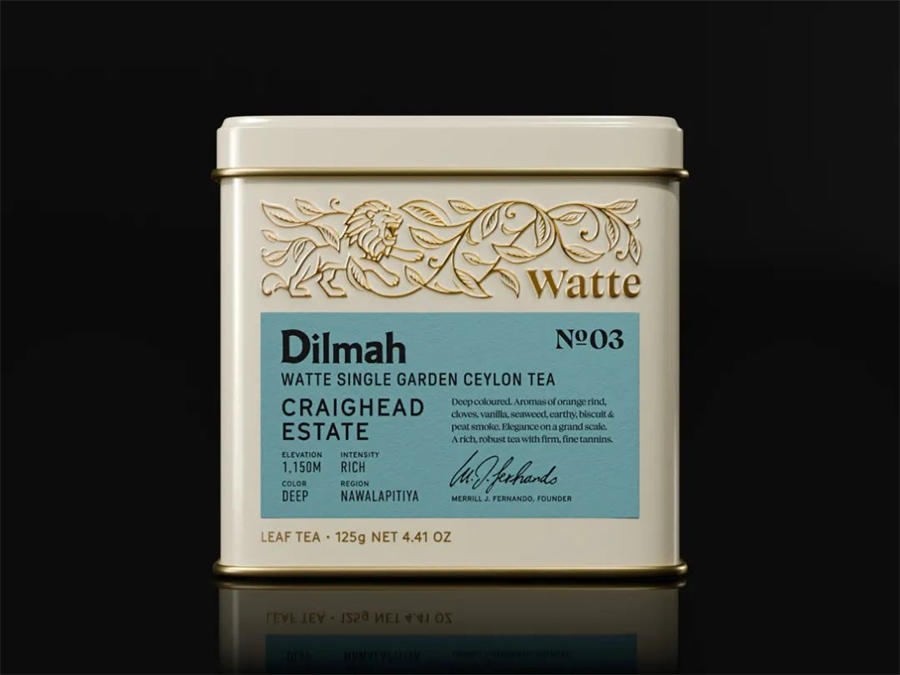 Dilmah Watte茶包装设计,铁罐包装正面上方的植物花纹凸起的工艺,为产品增加了高级的质感。