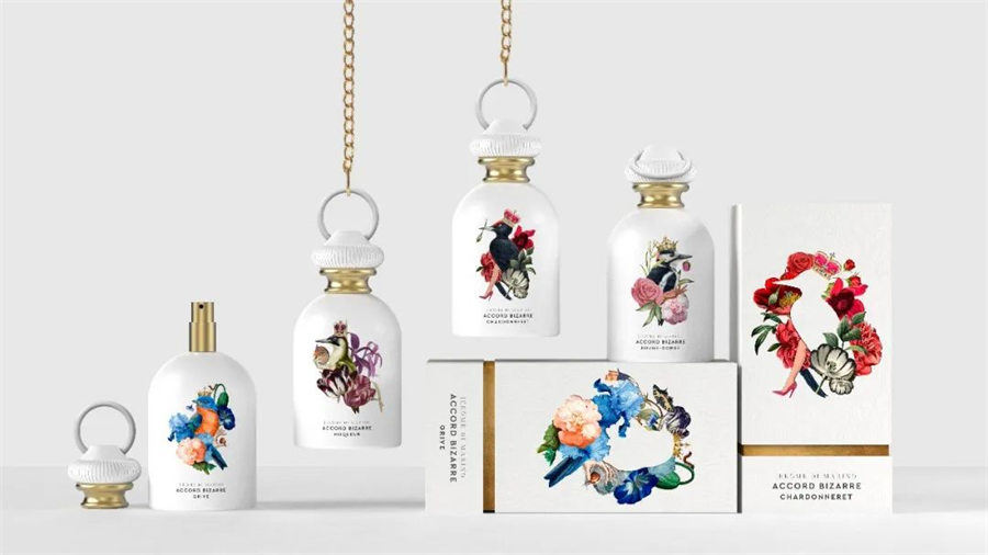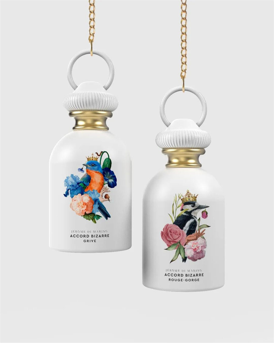 Accord Bizarre香水品牌以“鸟唱与飞”为核心意象,象征感官从束缚中逃逸,自由飞扬。香水包装设计采用简约标准瓶身,融合精致插画与解构美学,强化“荒诞·冲突·飞升”的品牌主张,唤起追求独特体验者的情感共鸣。
