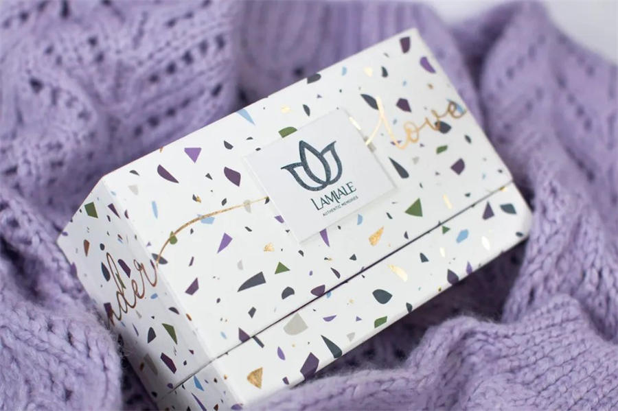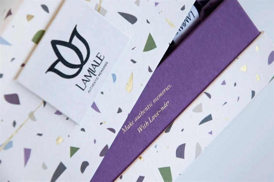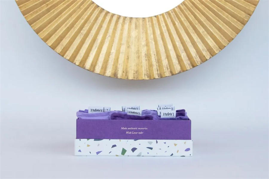 Lamiale薰衣草香囊包装设计的外盒图形使用了薰衣草原有的状态,薰衣草揉碎的样子,铺满整个盒子,再加上点缀形式的印刷工艺,使整个盒子看上去高级和自然,突出薰衣草。而在颜色的使用上接近与薰衣草的色系,搭配的和谐和自然。