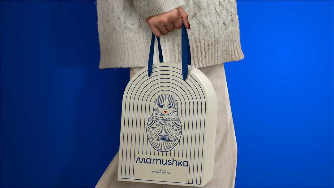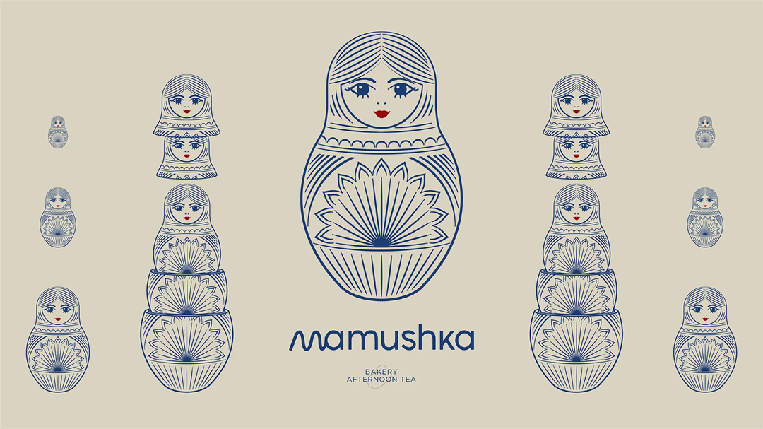 Mamushka的烘焙包装设计视觉形象隽永奢华,汲取了俄罗斯套娃的象征意义,它象征着不同世代给予的层层关怀。亲切圆润的字体,搭配米色与靛蓝的配色,并以红色点缀唇部,营造出温暖精致的氛围。这样的配色避免了过于鲜艳的色调,让你身处在整个环境中时可以感受到温馨与舒适。