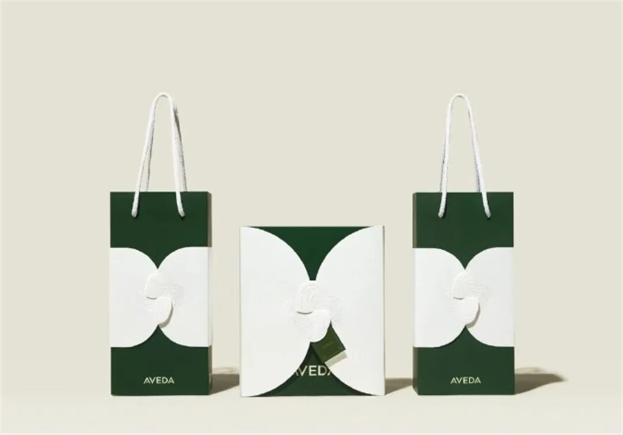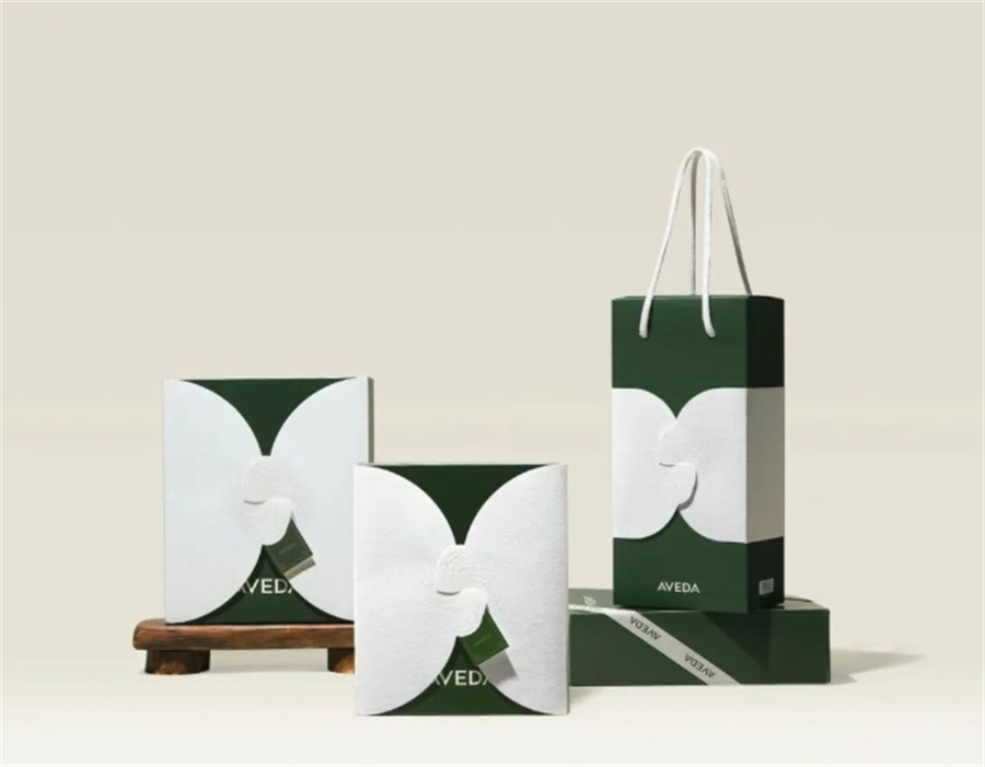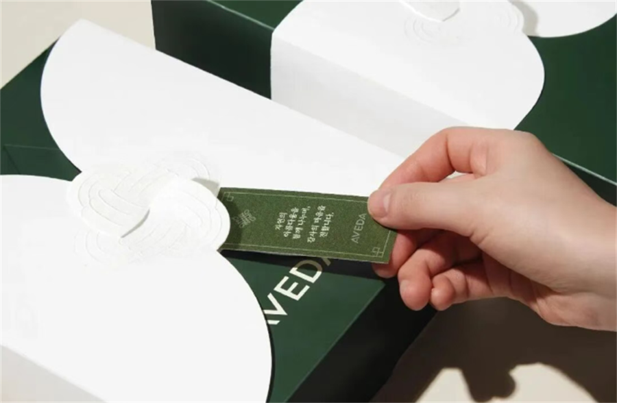 AVEDA的主色调为深绿搭配米白色,加上具有粗糙纹理质感的韩纸,尽显简约高级,非常契合品牌自然护肤的定位。方案最核心的设计为采用交错的蝴蝶扣装饰,搭配立体压纹工艺点缀,即强化了传统元素的质感,又替代了胶水,实现了符合环保的创新结构。