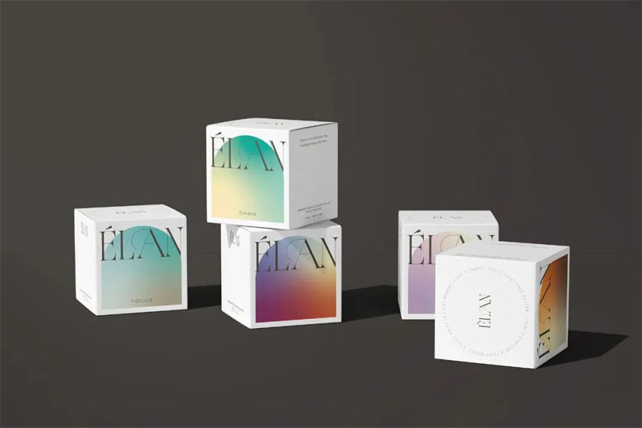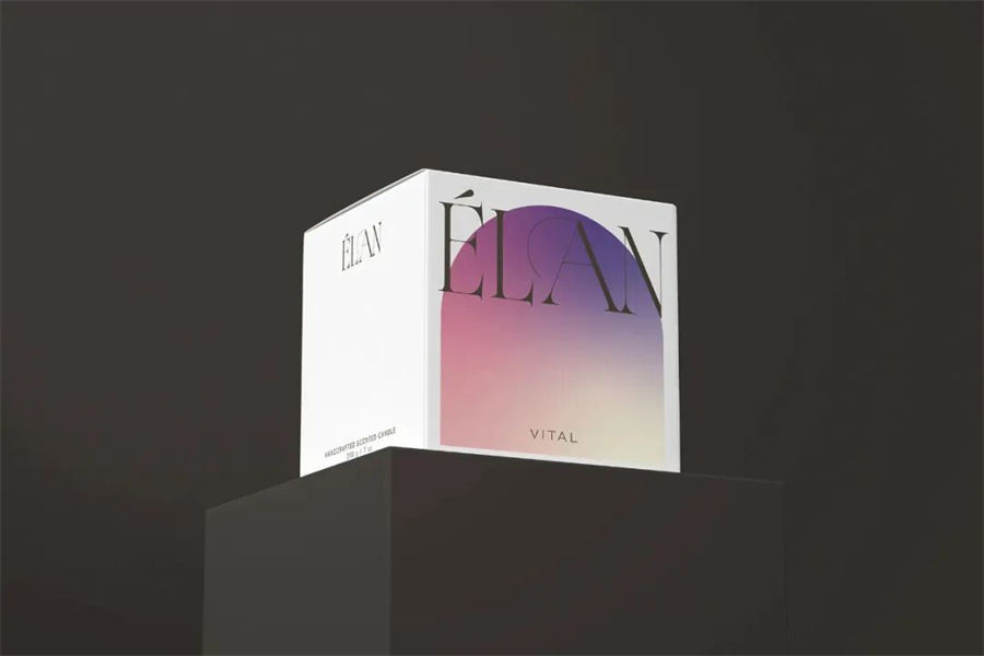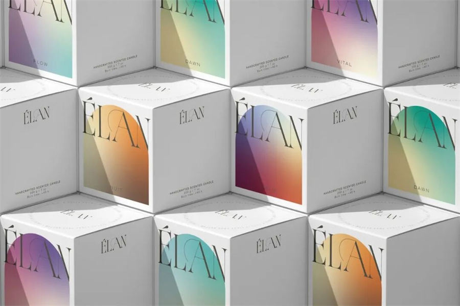 它的六种独特的蜡烛系列是精心制作的,以满足不同的情绪和需求。无论你是在漫长的一天后寻求放松,在工作中集中注意力,还是仅仅是一种平静和平衡的感觉。ÉLAN香氛蜡烛包装设计以光的概念出现在包装上,不同的香味以不同的渐变色来表示,这些渐变色形似黑暗中的光照,包装整体是白色,以一种干净和醒目的视觉方式被呈现出来。