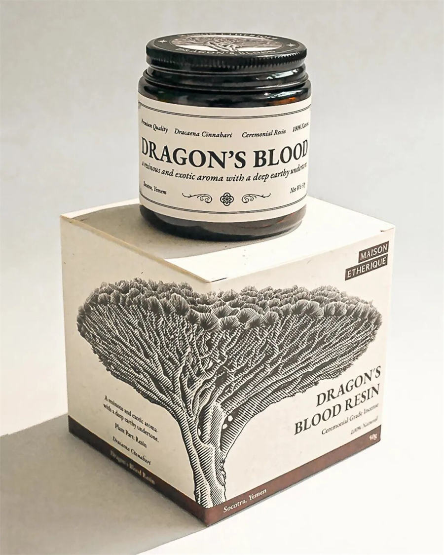 Maison Etherique香氛包装设计方案围绕着使用插图作为主要的交流手段。为了给每个包装赋予自己独特的身份,同时保持整个系列的一致性,设计师决定制作手工雕刻的插图,这些插图将覆盖盒子表面的很大一部分。这些插图是精心制作的,以代表香氛的特定植物,不仅展示了植物的美丽,还展示了它的文化和植物学意义。错综复杂的艺术品旨在唤起一种工艺感和真实感,呼应该品牌的复古和乡村美学。