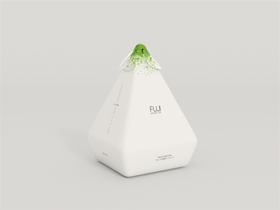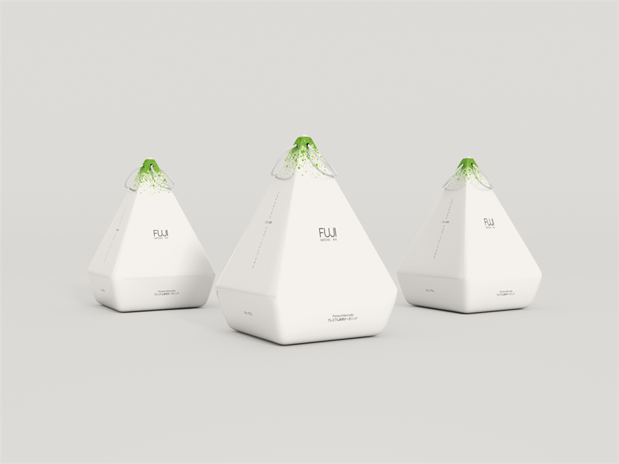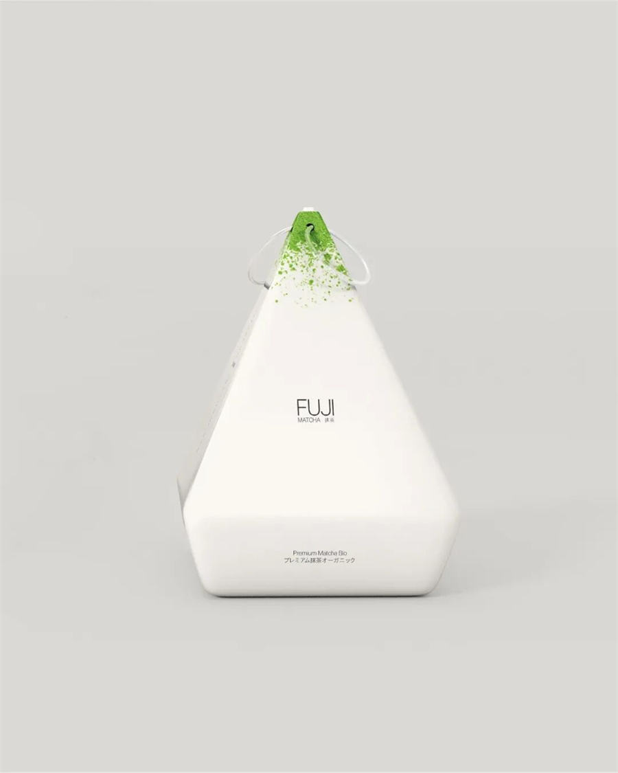 Fuji Matcha高端抹茶包装设计的核心设计解决方案是利用三维颠覆性形状来解决货架上的注意力挑战,同时将品牌理念具象化。设计师 Marco Arroyo-Vázquez 放弃了传统的茶饮包装形式,选择了灵感来源于富士山雪顶的极简几何多面体容器。这种独特的结构并非仅为吸引眼球,它直接服务于两大商业目标:最大化货架吸引力和锚定产地价值。