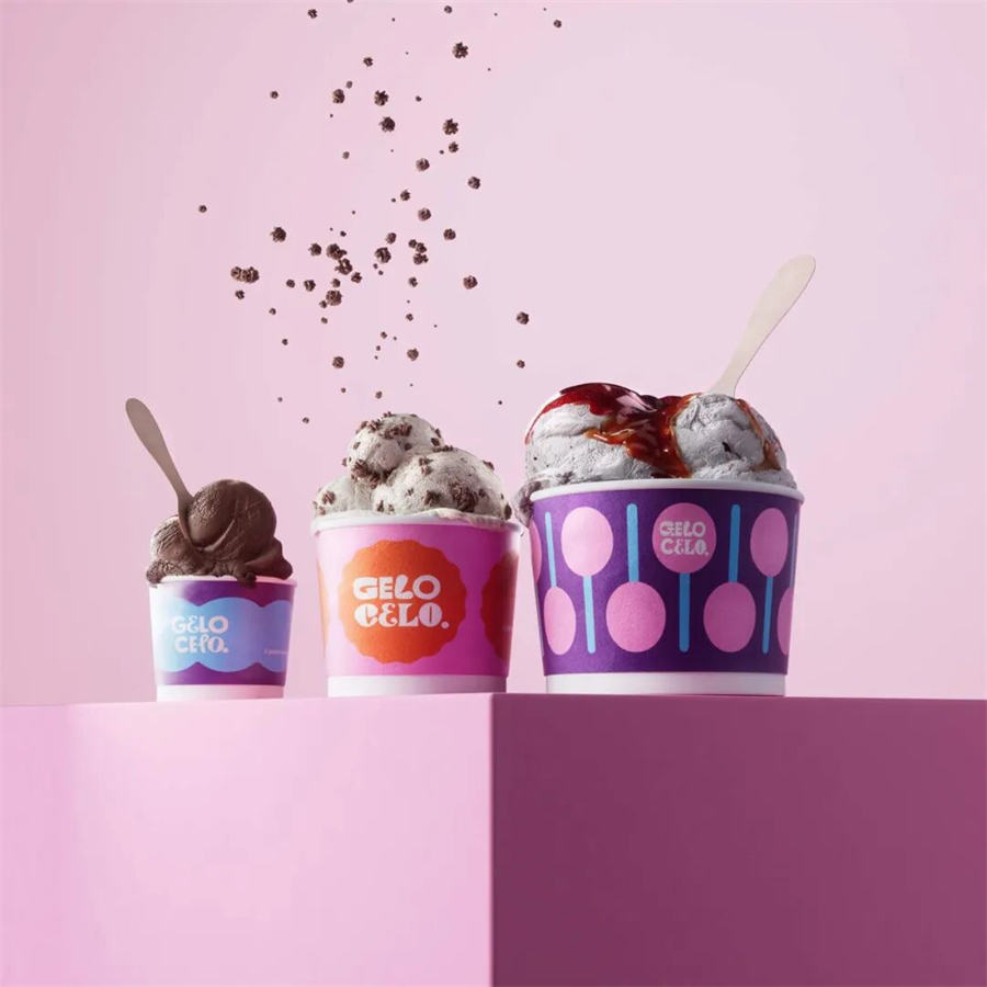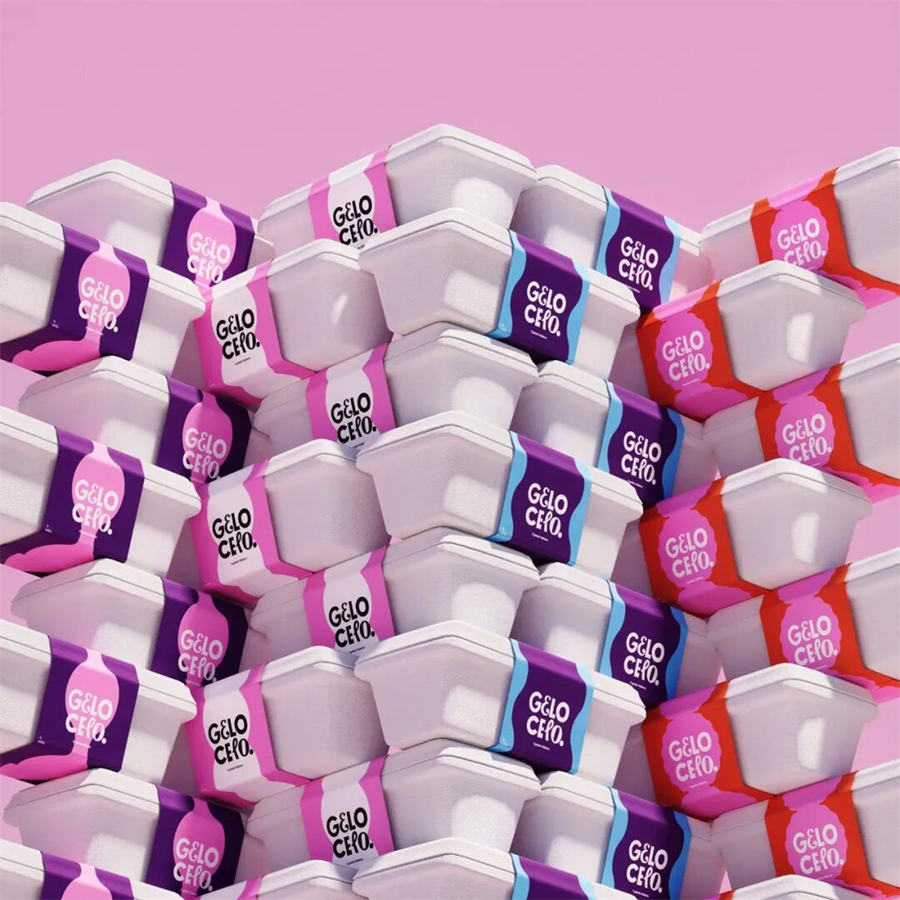 在色彩上,Gelo Celo 冰淇淋包装设计大胆采用饱和、明亮、对比强烈的方案,以呼应冰淇淋丰富口味与记忆感。与此同时,材质与印刷包装也强调触感、手感——比如大面积色块+曲线图形+镀亮效果或浑厚印刷。这样,品牌视觉传达不仅仅“看起来年轻”,而是“触得见、吃得出、记得住”。
