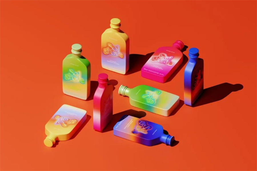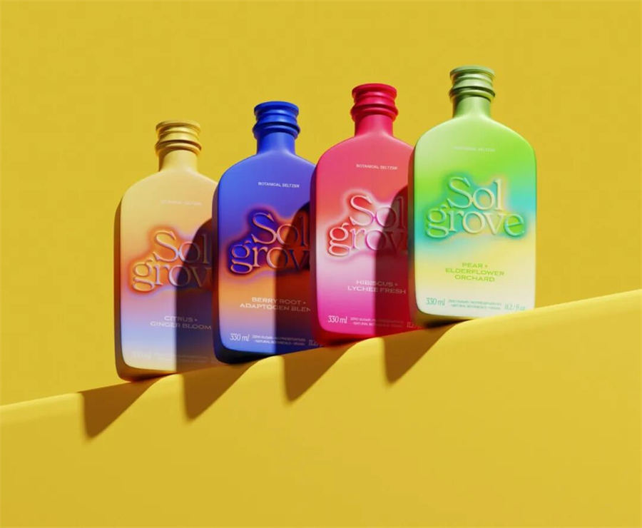 Sol Grove 是一个以植物成分为基础的气泡水品牌,品牌的出发点并非强调“补充能量”,而是关注能量在身体中的状态与流动。由 Rakesh Khilare 主导的气泡水包装设计提出了一个明确的核心概念——能量流Energy Flow。设计灵感来自人体热感图与能量分布的视觉方式,包装不再描绘水果或植物形态,而是通过渐变色模拟能量在身体中扩散、升温或沉静的过程。不同口味被转译为不同色域,色彩不指向原料本身,而指向饮用后的体感。