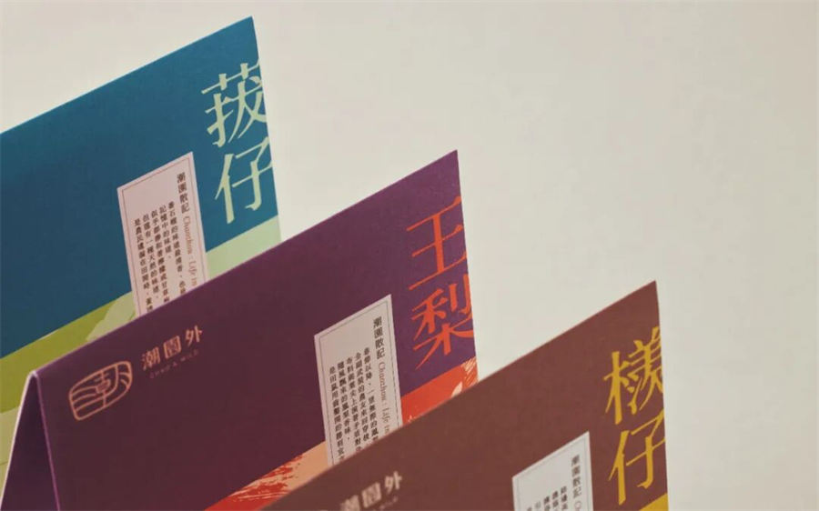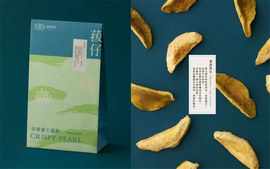 本次潮园外的果干包装设计,有别于市场上多以具象和高饱和果实实物图为主流的风格,旨在展现潮州镇作为台湾省农业摇篮的风貌,并阐扬百年老潮庄的文史意涵。以诗集的理念呈现,融合东方水墨意象,大量留白,并将果干自然舒展的形态与流畅的飞白笔法相结合,使画面兼具雅洁与灵动。亦可选用低饱和度、中明亮度的色彩,来呈现果干经低温烘烤后逐渐熟成的过程。