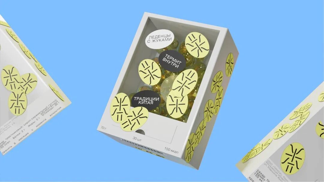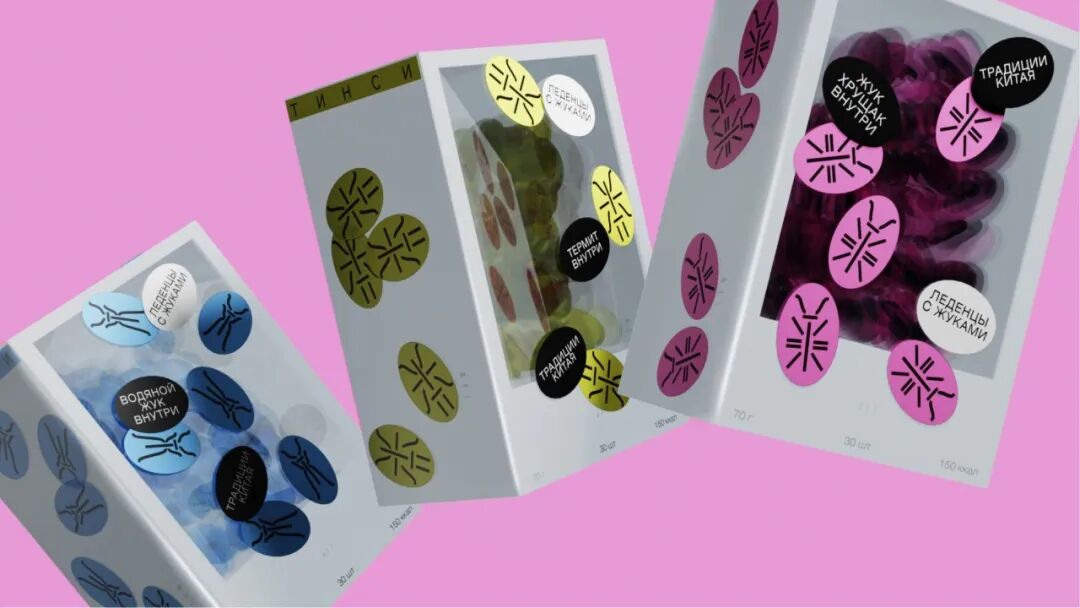 TINSI 的产品设定很直接:棒棒糖里封着虫子,灵感来自中国街头文化,把“尝一口虫子”定义成一种边界探索的体验。它面对的品类难点也很现实——卖点越不寻常,越需要包装先建立可接受的入口,否则消费者只会停留在抗拒。这个项目的策略是把话题从“冲击”移到“好玩”:用街头语境给体验一个位置,让人愿意拿起、愿意带走、愿意在社交场景里打开。