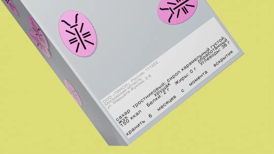 俄罗斯的 TINSI 棒棒糖包装设计的核心逻辑是把中国自动售货机的视觉与动作,变成包装语言。盒子使用塑料材质,强调可重复使用;外形接近自动售货机的矩形轮廓,正面开透明窗让糖体可见,底部做取物小门,取糖动作像“从机器里取货”,同时满足路上食用的便利性。真正让品牌识别成立的是贴纸系统:贴纸复刻盒内糖果的形状,并用不同颜色区分口味;每张贴纸里嵌入风格化字母,组合后形成类似昆虫的象形图案。贴纸随机分布,既像街头涂贴,也像虫子无序爬行,于是“虫子”被转译成一套可变化的图形机制,每一盒都天然不同。