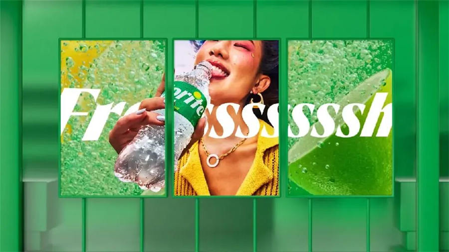 为了配合「It’s That Fresh」,雪碧同步更新了品牌l视觉设计体系,包括全新品牌LOGO设计与产品包装设计,并让经典的「Lymon」符号回归。整体设计强调更加清晰、锐利的视觉表达,字标、符号与配色都被强化为更具「柑橘般清爽感」的形态,使品牌呈现出更强的冲击力与动感。