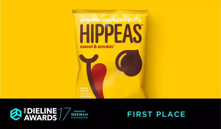 Hippeas快消品的包装设计采用“HIPPEA脸”,配以大胆的黄色,脸部的眼睛巧妙地引用了鹰嘴豆,帮助在头脑中创造了一个微笑的模样。使品牌在网上和消费者的心目中轻松脱颖而出。