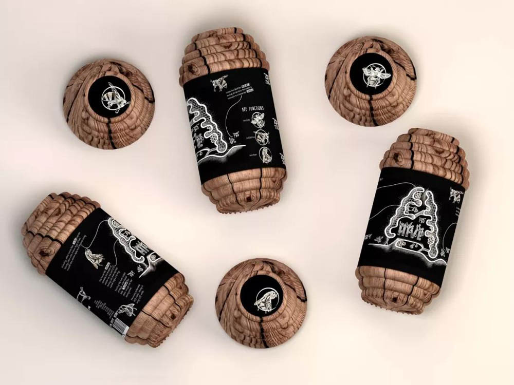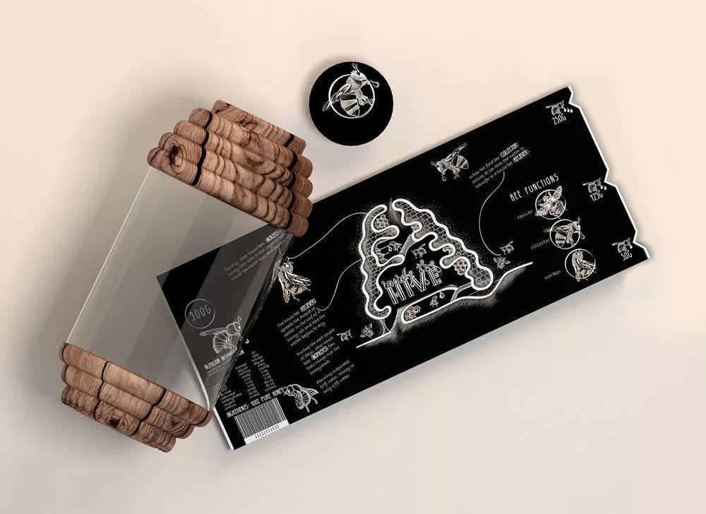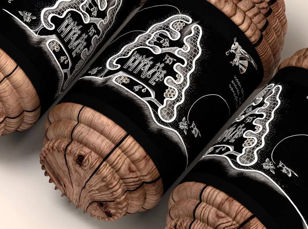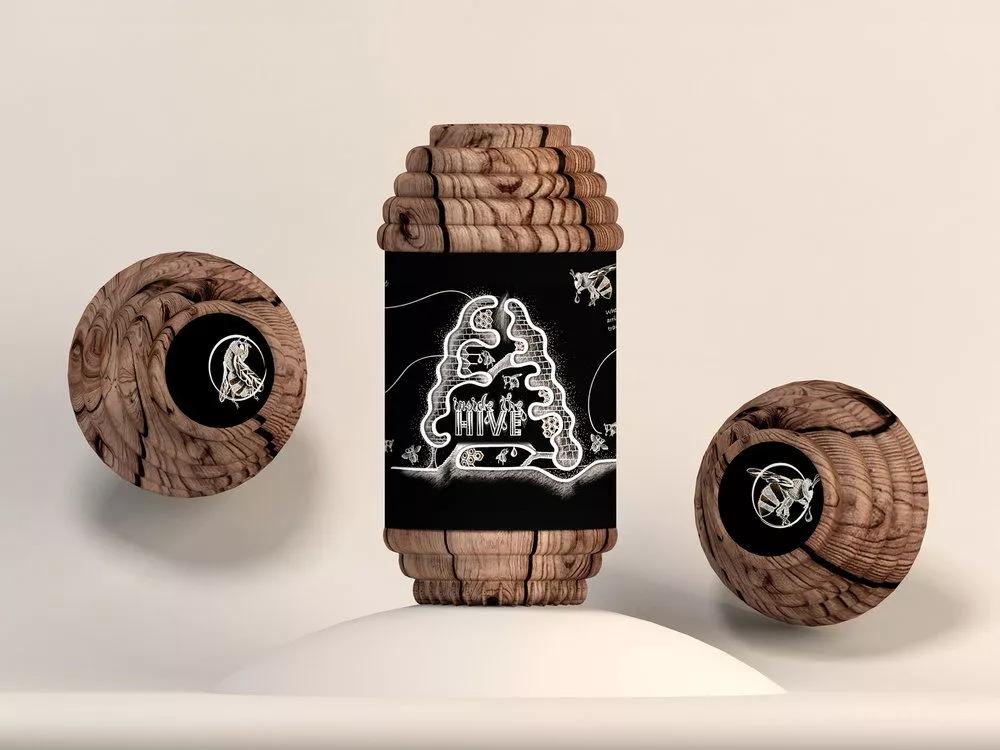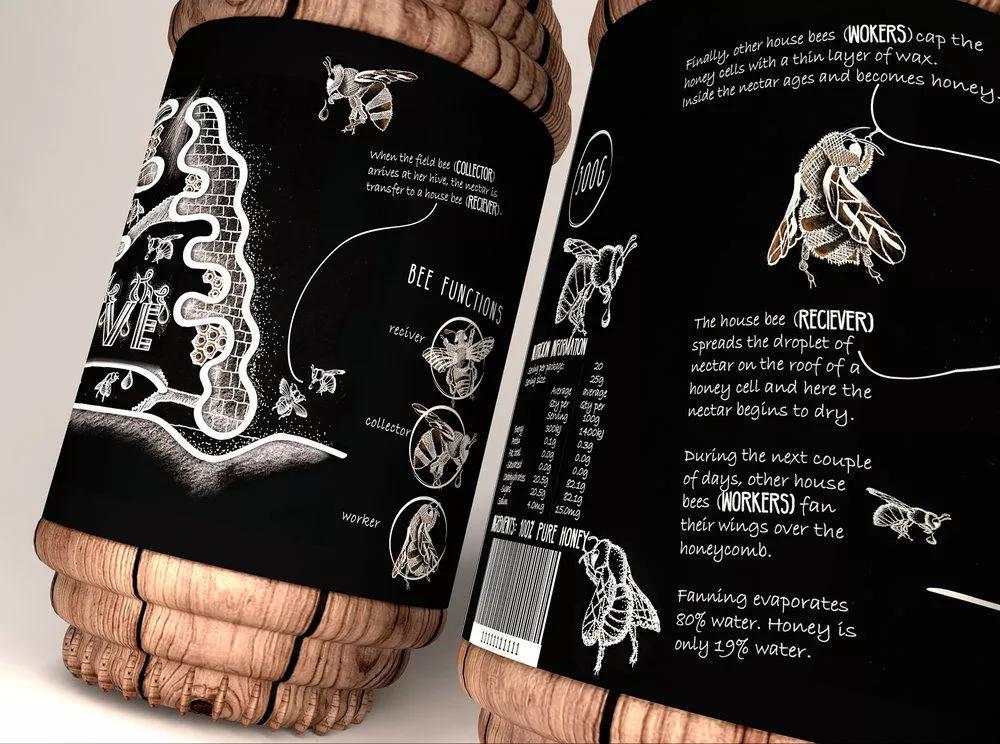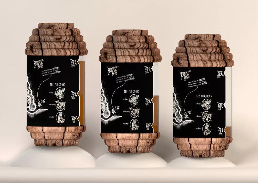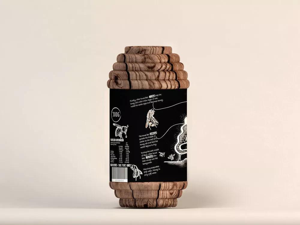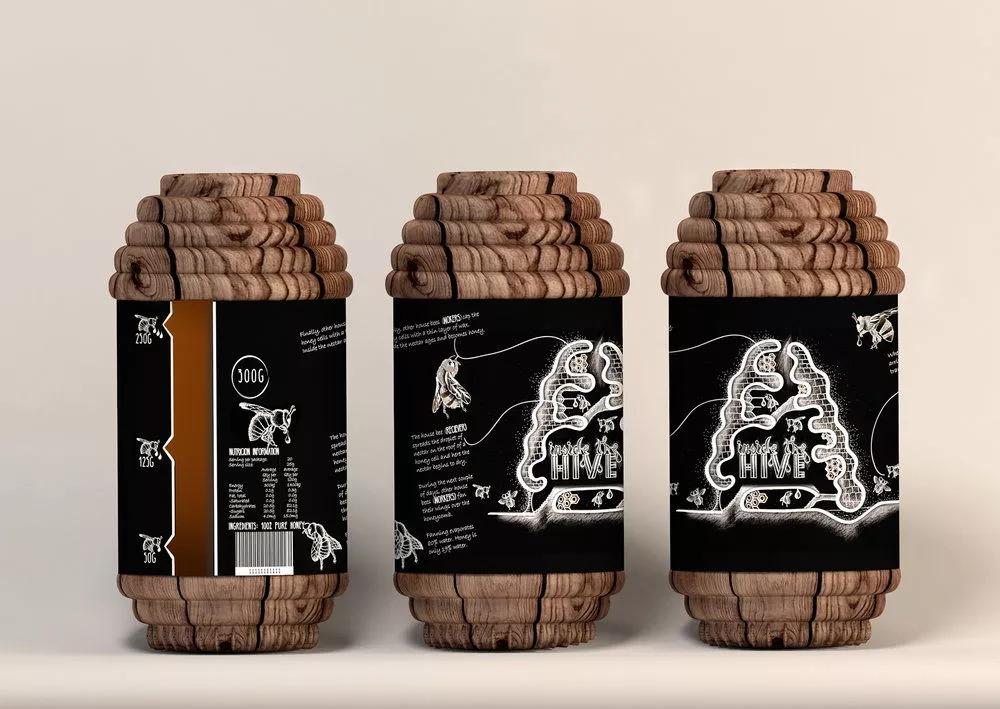 这款蜂蜜包装设计将蜂巢的灵感融入其中,将罐子设计成蜂巢形状,同时选用原木的材质制作,创作出一款原生态的蜂蜜产品,以突出该产品的特征和调性。