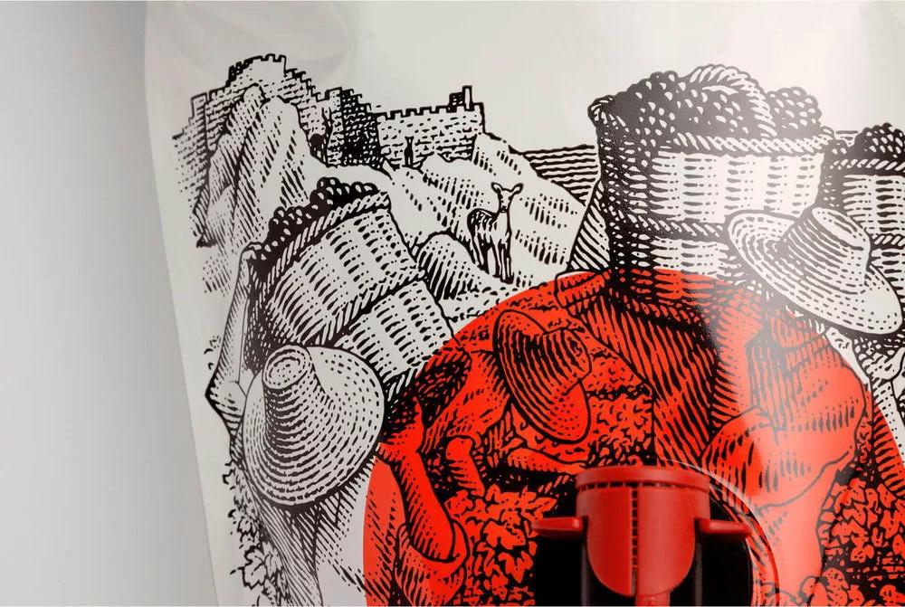 这是一款来自希腊Limnos利姆诺斯岛的葡萄酒品牌,包装设计上采用手绘黑白线条的表现形式,绘制了当地人民辛勤劳作为主题的插画图案。