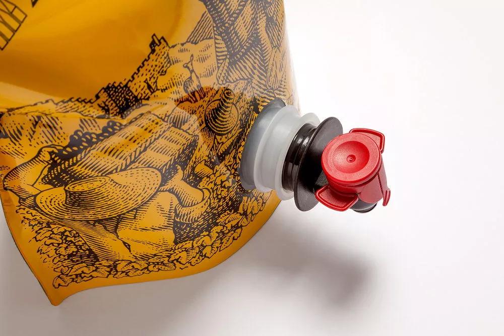 不同于传统的葡萄酒包装,该产品采用袋装的形式,并且在袋子正下方安装了个开关形式的装置,相对来说更加方便使用。整体包装设计非常的独特,令人向往。